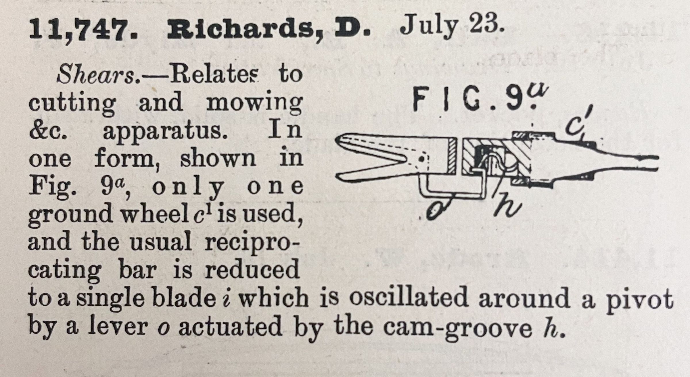 Shears. -- Relates to cutting and mowing &c. apparatus. In one form, shown in Fig. 9a, only one ground wheel c1 is used, and the usual reciprocating bar is reduced to a single blade i which is oscillated around a pivot by a lever o actuated by the cam-groove h.Cataloged By
