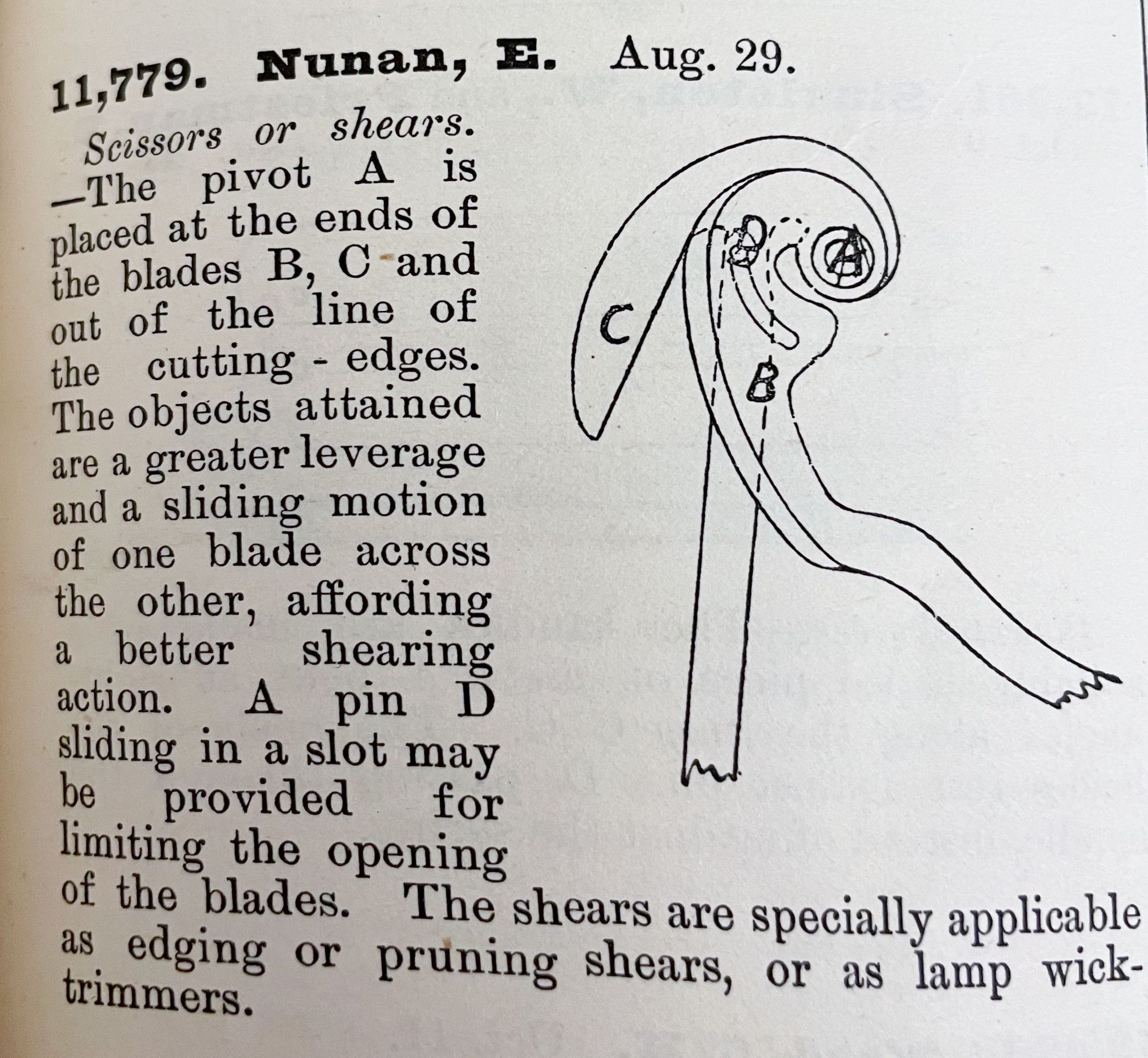 Scissors or shears. -- The pivot A is placed at the ends of the blades B, C and out of the line of the cutting-edges. The objects attained are a greater leverage and a sliding motion of one blade across the other, affording a better shearing action. A pin D sliding in a slot may be provided for limiting the opening of the blades. The shears are specially applicable as edging or pruning shears, or as lamp wick-trimmers.Cataloged By