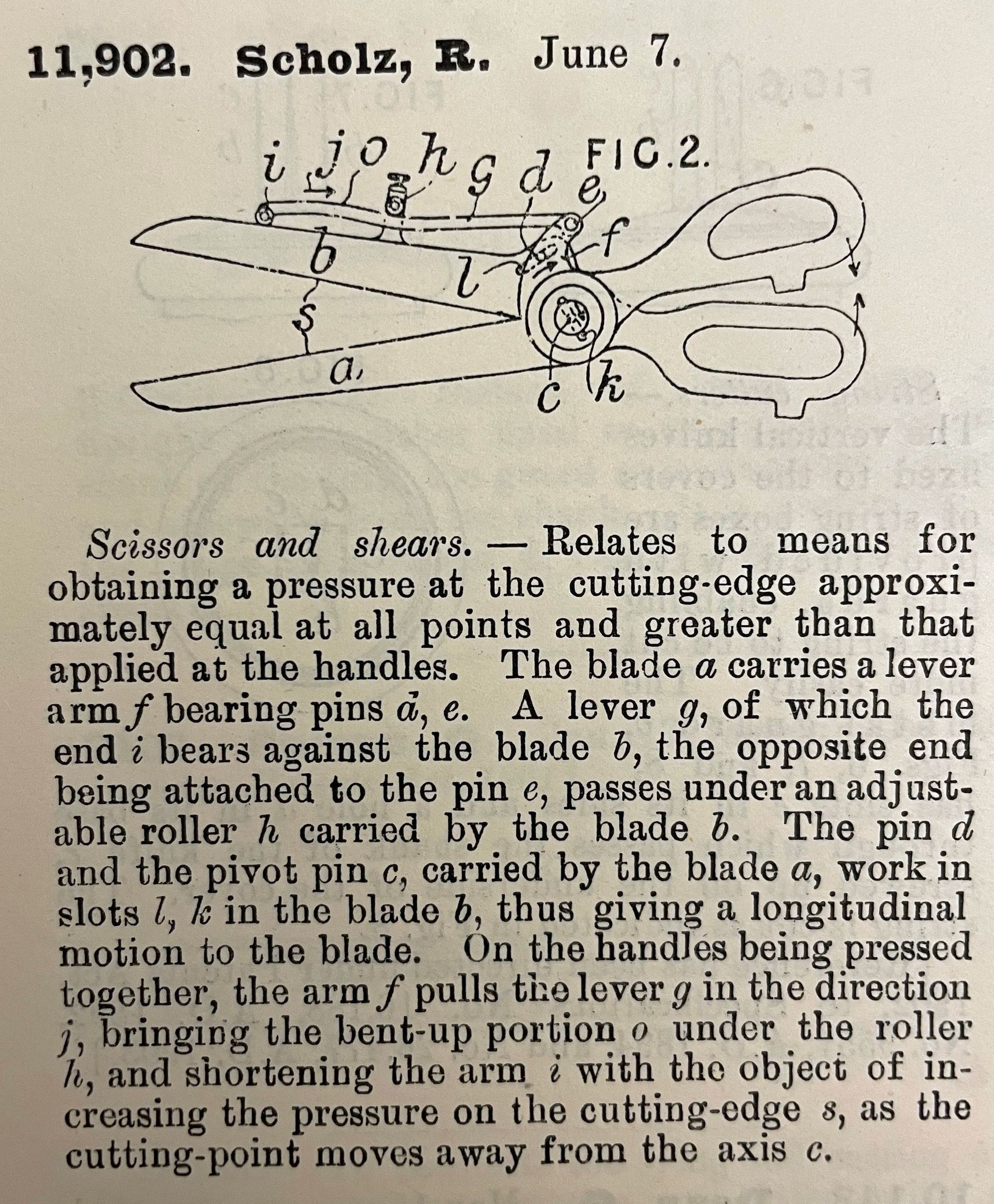 Scissors and shears. -- Relates to means for obtaining a pressure at the cutting-edge approximately equal at all points and greater than that applied at the handles. The blade a carries a lever arm f bearing pins d, e. A lever g, of which the end i bears against the blade b, the opposite end being attached to the pin e, passes under an adjustable roller h carried by the blade b. The pin d and the pivot pin c, carried by the blade a, work in slots l, k in the blade b, thus giving a longitudinal motion to the blade. On the handles being pressed together, the arm f pulls the lever g in the direction j, bringing the bent-up portion o under the roller h, and shortening the arm I with the object of increasing the pressure on the cutting-edge s, as the cutting-pint moves away from the axis c.Cataloged By