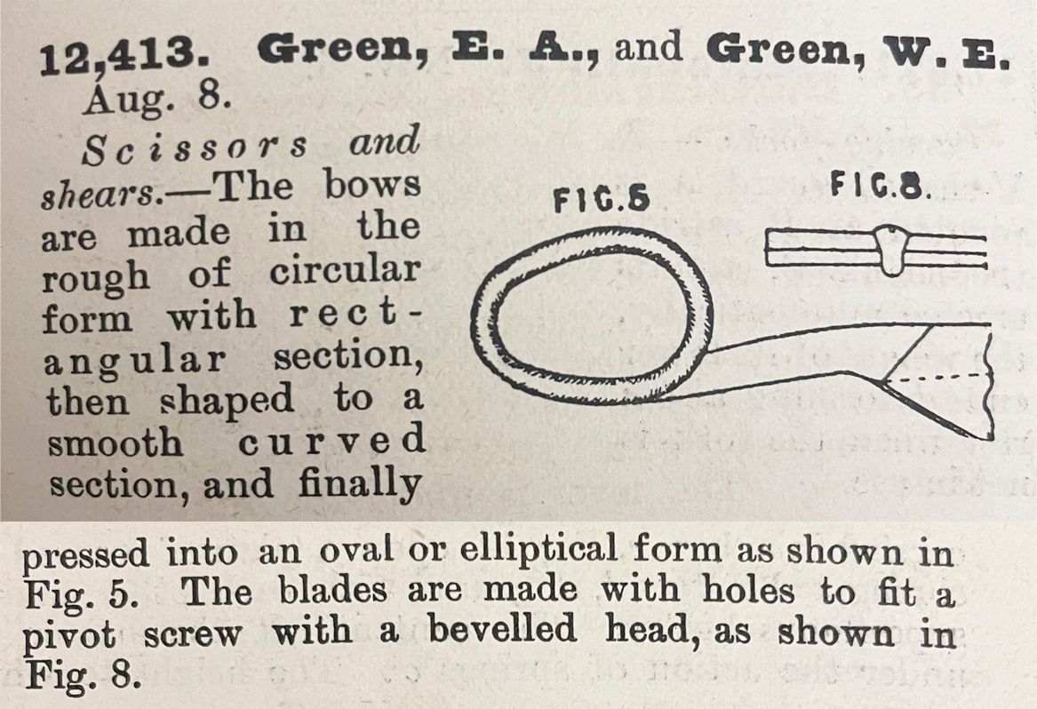 Scissors and shears. -- The bows are made in the rough of circular form with rectangular section, then shaped to a smooth curved section, and finally pressed into an oval or elliptical form as shown in Fig. 5. The blades are made with holes to fit a pivot screw with a bevelled head, as shown in Fig. 8.Cataloged By