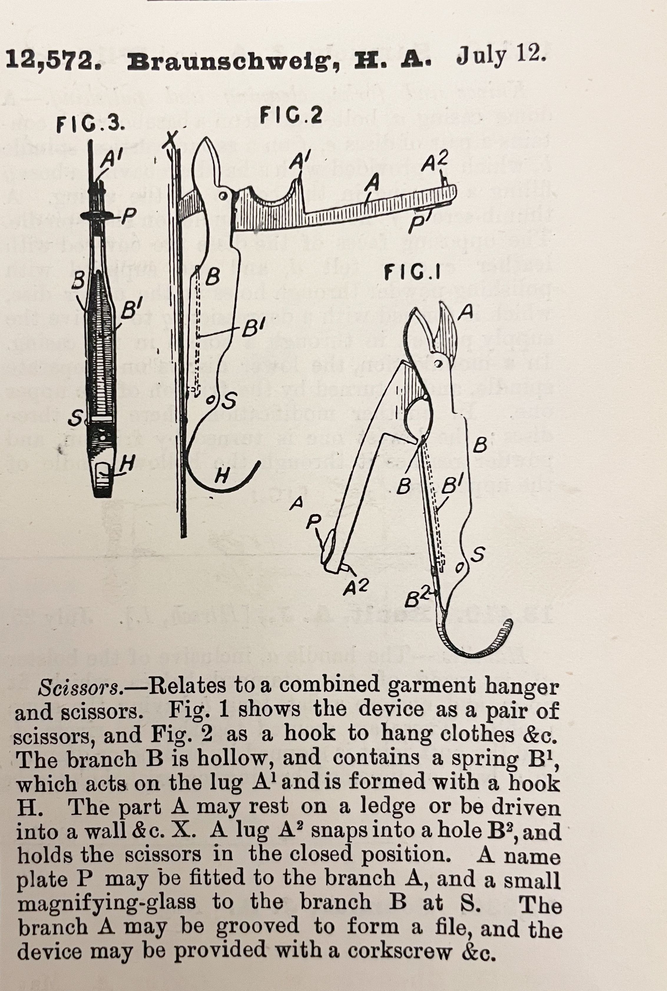 Scissors. -- Relates to a combined garment hanger and scissors. Fig. 1 shows the device as a pair of scissors, and Fig. 2 as a hook to hang clothes &c. The branch B is hollow, and contains a spring B1, which acts on the lug A1 and is formed with a hook H. The part A may rest on a ledge or be driven into a wall &c. X. A lug A2 snaps into a hole B2, and holds the scissors in the closed position. A name plate P may be fitted to the branch A, and a small magnifying-glass to the branch B at S. The branch A may be grooved to form a file, and the device may be provided with a corkscrew &c.Cataloged By
