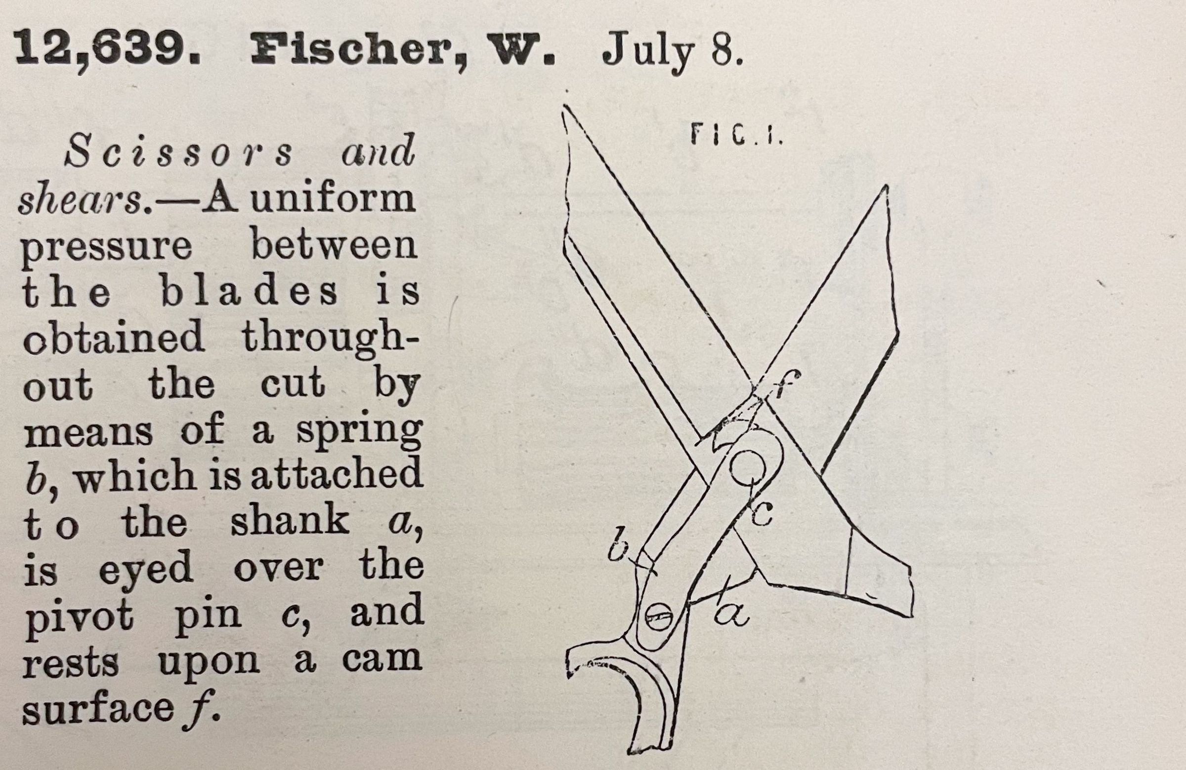 Scissors and shears. -- A uniform pressure between the blades is obtained throughout the cut by means of a spring b, which is attached to the shank a, is eyed over the pivot pin c, and rests upon a cam surface f.Cataloged By