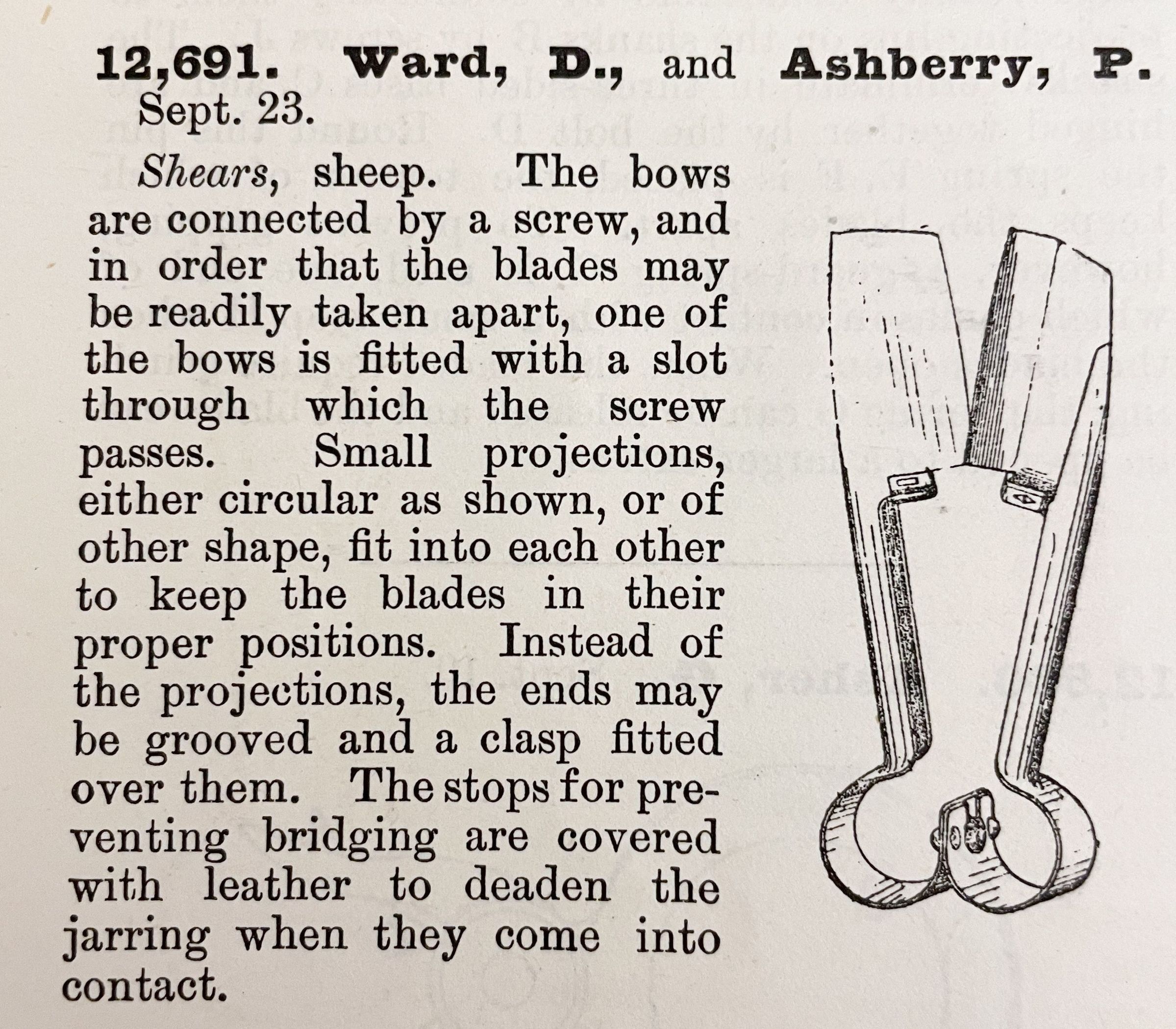 Shears, sheep. The bows are connected by a screw, and in order that the blades may be readily taken apart, one of the bows is fitted with a slot through which the screw passes. Small projections, either circular as shown, or of other shape, fit into each other to keep the blades in their proper positions. Instead of the projections, the ends may be grooved and a clasp fitted over them. The stops for preventing bridging are covered with leather to deaden the jarring when they come into contact.Cataloged By