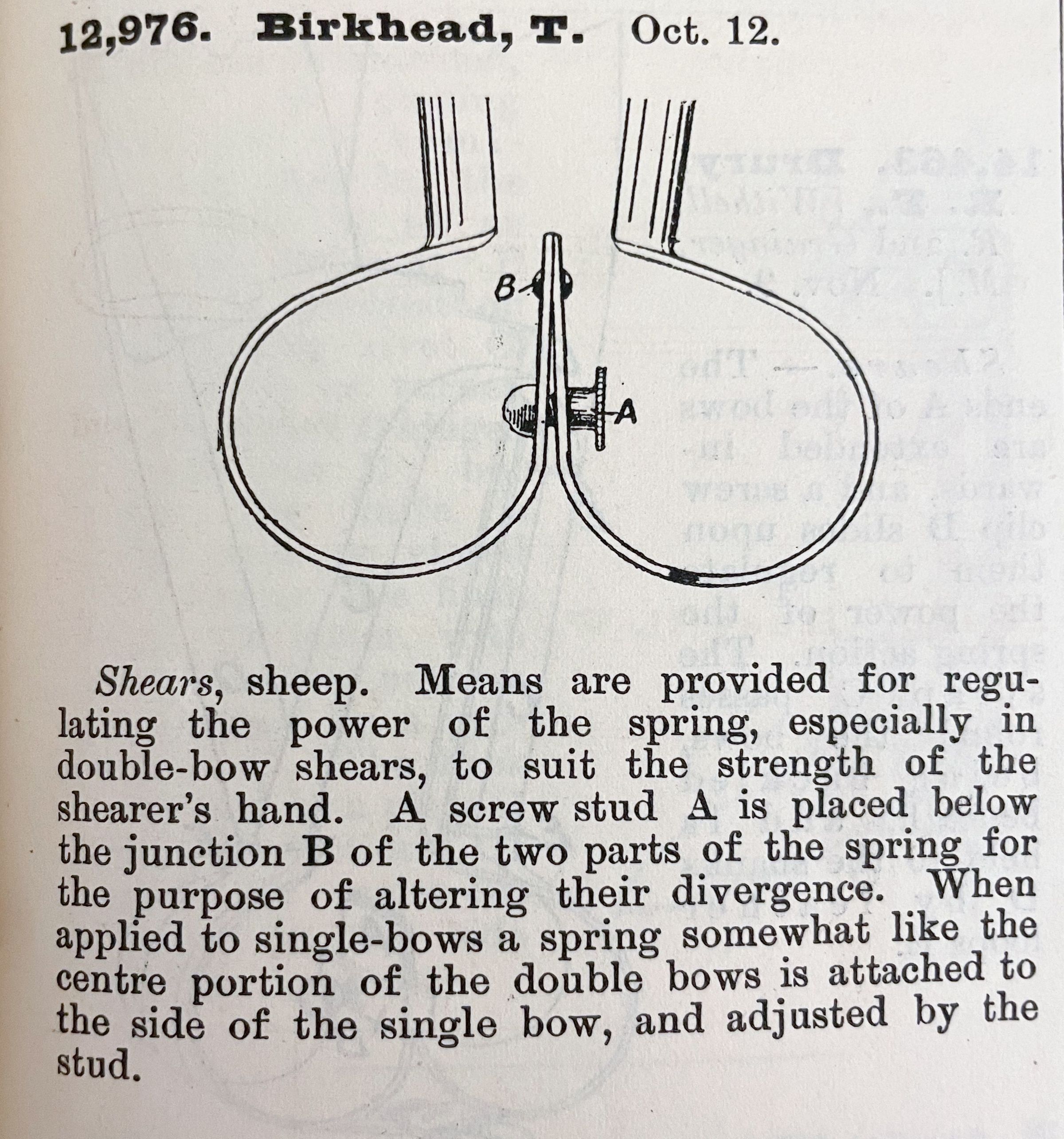 Shears, sheep. Means are provided for regulating the power of the spring, especially in double-bow shears, to suit the strength of the shearer's hand. A screw stud A is placed below the junction B of the two parts of the spring for the purpose of altering their divergence. When applied to single-bows a spring somewhat like the centre portion of the double bows is attached to the side of the single bow, and adjusted by the stud.Cataloged By