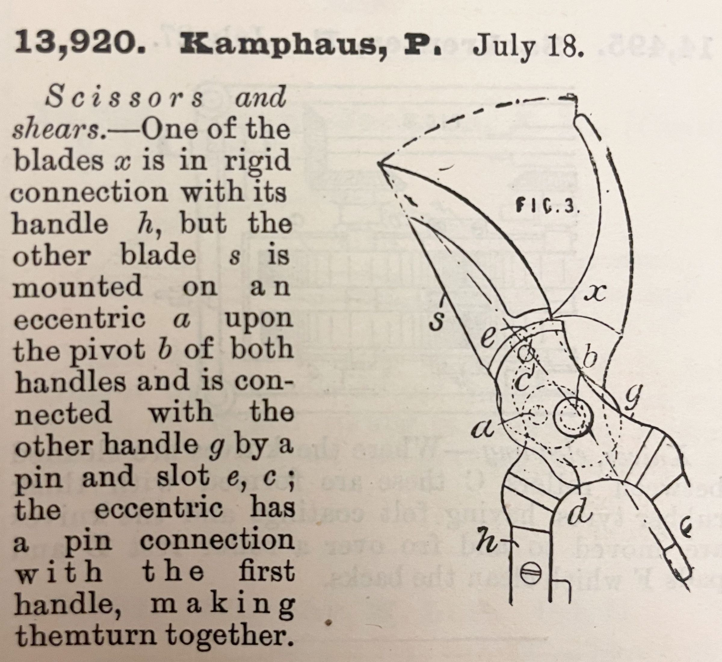 Scissors and shears. -- One of the blades x is in rigid connection with its handle h, but the other blade s is mounted on an eccentric a upon the pivot b of both handles and is connected with the other handle g by a pin and slot e, c; the eccentric has a pin connection with the first handle, making them turn together.Cataloged By
