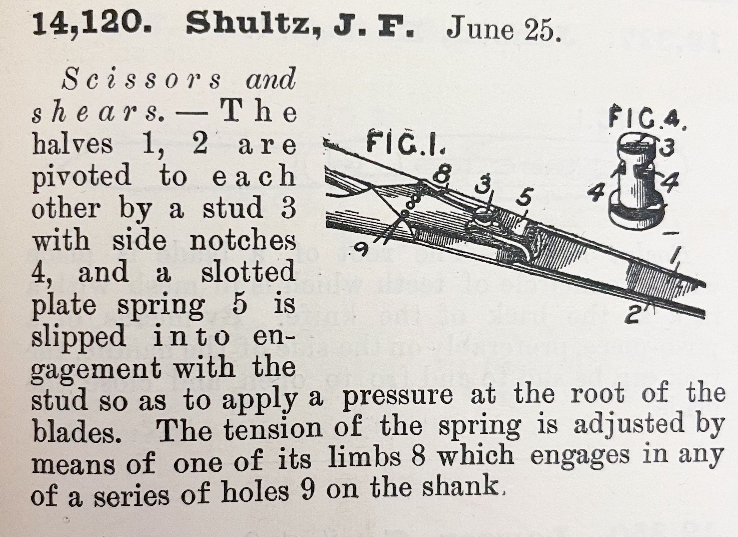 Scissors and shears. -- The halves 1, 2 are pivoted to each other by a stud 3 with side notches 4, and a slotted plate spring 5 is slipped into engagement with the stud so as to apply a pressure at the root of the blades. The tension of the spring is adjusted by means of one of its limbs 8 which engages in any of a series of holes 9 on the shank.Cataloged By