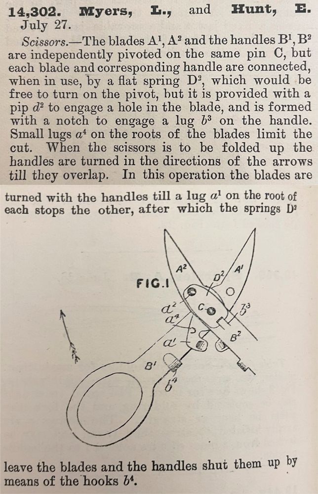 Scissors. -- The blades A1, A2 and the handles B1, B2 are independently pivoted on the same pin C, but each blade and corresponding handle are connected, when in use, by a flat spring D2, which would be free to turn on the pivot, but it is provided with a pip d2 to engage a hole in the blade, and is formed with a notch to engage a lug b3 on the handle. Small lugs a4 on the roots of the blades limit the cut. When the scissors is to be folded up the handles are turned in the directions of the arrows till they overlap. In this operation the blades are turned with the handles till a lug a1 on the root of each stops the other, after which the springs D2 leave the blades and the handles shut them up by means of the hooks b4.Cataloged By