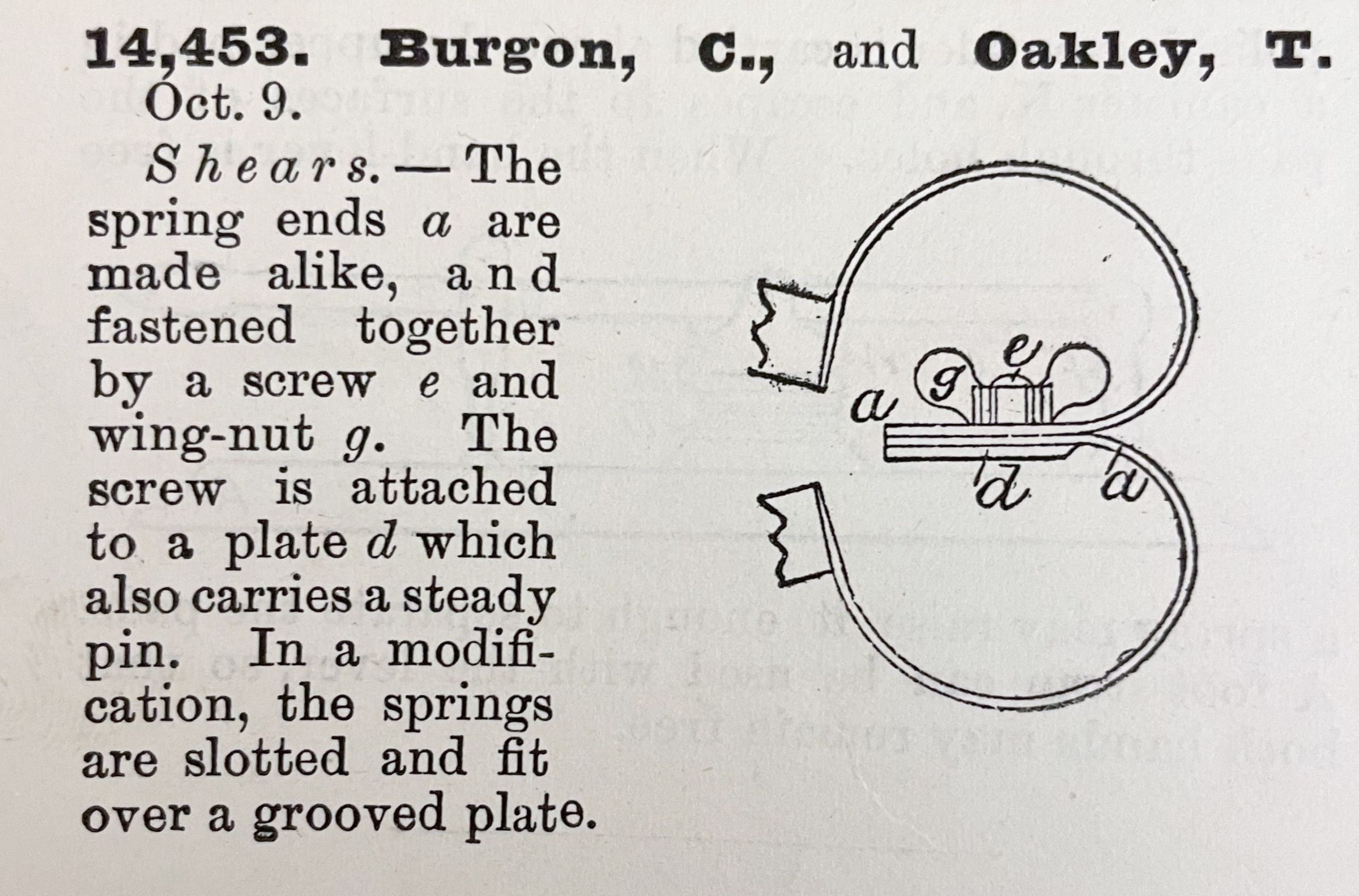 Shears. -- The spring ends an are made alike, and fastened together by a screw e and wing-nut g. The screw is attached to a plate d which also carries a steady pin. In a modification, the springs are slotted and fit over a grooved plate.Cataloged By