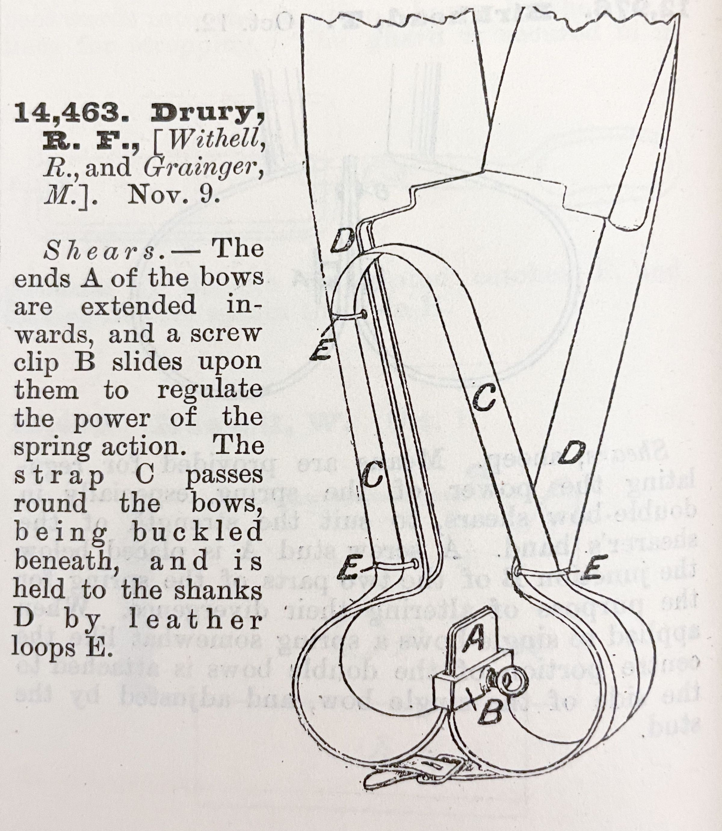 Shears. -- The ends A of the bows are extended inwards, and a screw clip B slides upon them to regulate the power of the spring action. The strap C passes round the bows, being buckled beneath, and is held to the shanks D by leather loops E.Cataloged By