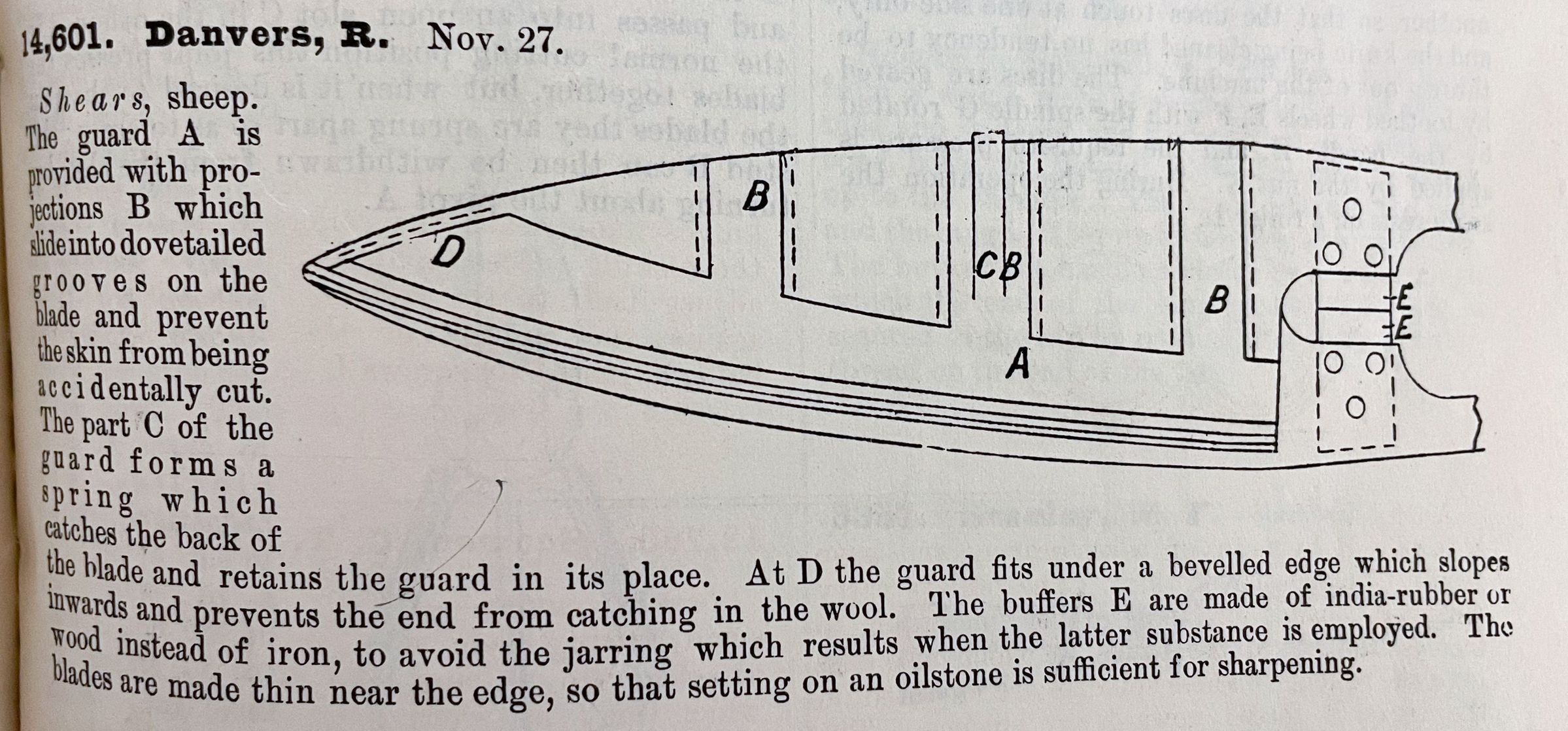 Shears, sheep. The guard A is provided with projections B which slide into dovetailed grooves on the blade and prevent the skin from being accidentally cut. The part of C of the guard forms a spring which catches the back of the blade and retains the guard in its place. At D the guard fits under a bevelled edge which slopes inwards and prevents the end from catching in the wool. The buffers E are made of india-rubber or wood instead of iron, to avoid the jarring which results when the latter substance is employed. The blades are made thin near the edge, so that setting on an oilstone is sufficient for sharpening.Cataloged By