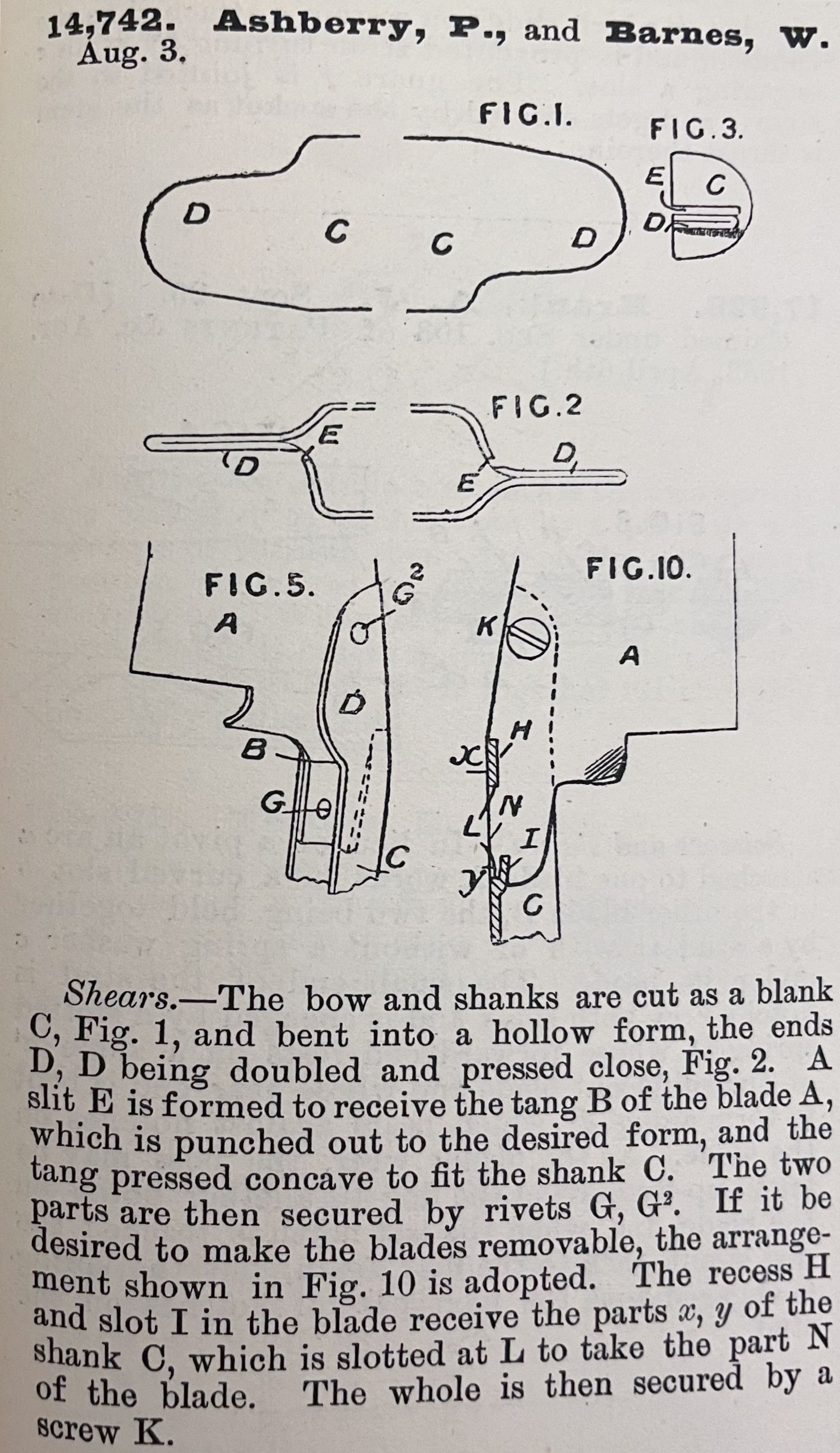 Shears. -- The bow and shanks are cut as a blank C, Fig. 1, and bent into a hollow form, the ends D, D being doubled and pressed close, Fig. 2. A slit E is formed to receive the tang B of the blade A, which is punched out to the desired form, and the tang pressed concave to fit the shank C. The two parts are then secured by rivets G, G2. If it be desired to make the blades removable, the arrangement shown in Fig. 10 is adopted. The recess H and slot I in the blade receive the parts x, y of the shank C, which is slotted at L to take the part N of the blade. The whole is then secured by a screw K.Cataloged By