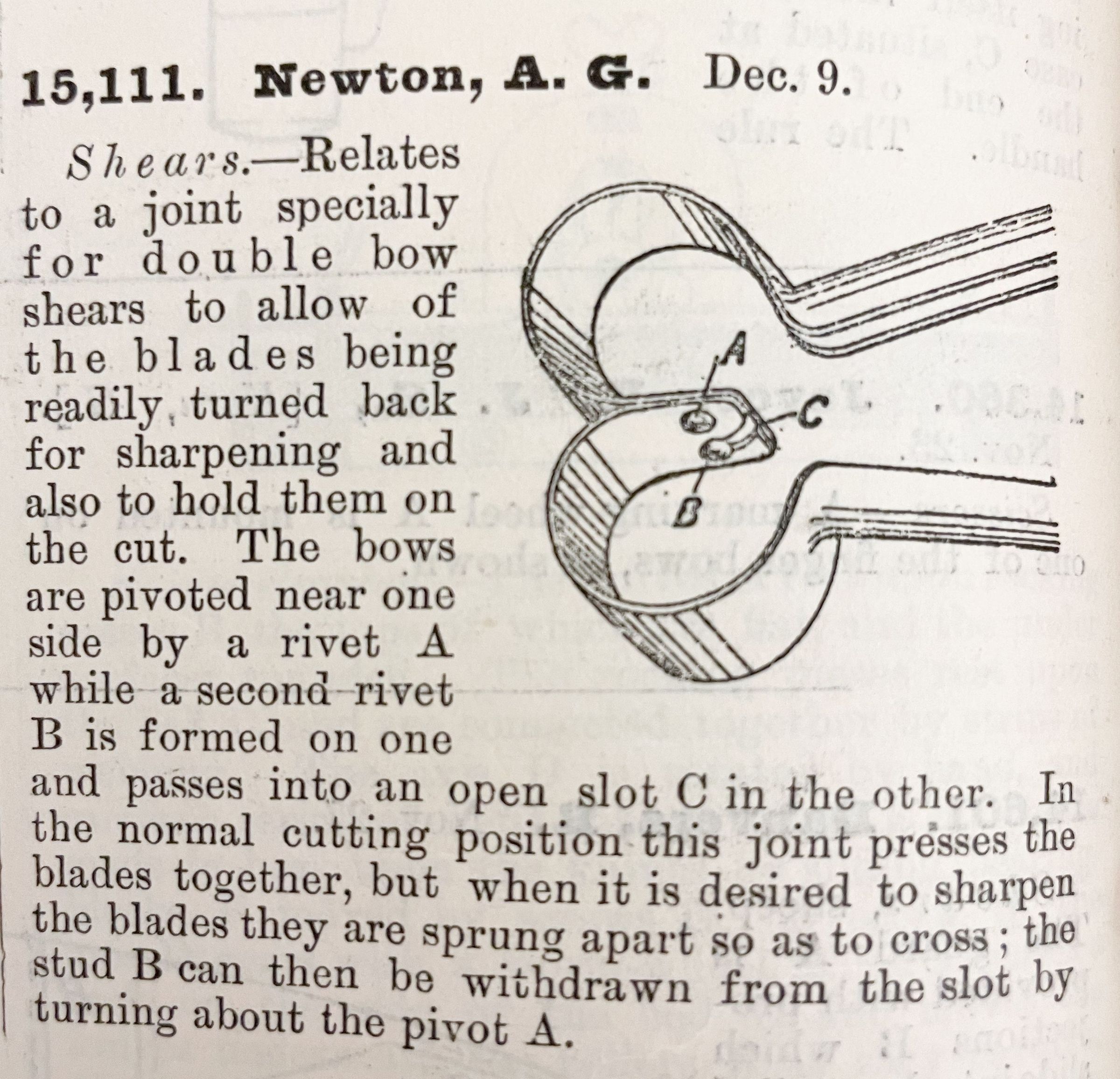 Shears. -- Relates to a joint specially for double bow shears to allow of the blades being readily turned back for sharpening and also to hold them on the cut. The bows are pivoted near one side by a rivet A while a second rivet B is formed on one and passes into an open slot C in the other. In the normal cutting position this joint presses the blades together, but when it is desired to sharpen the blades they are sprung apart so as to cross; the stud B can then be withdrawn from the slot by turning about the pivot A.Cataloged By