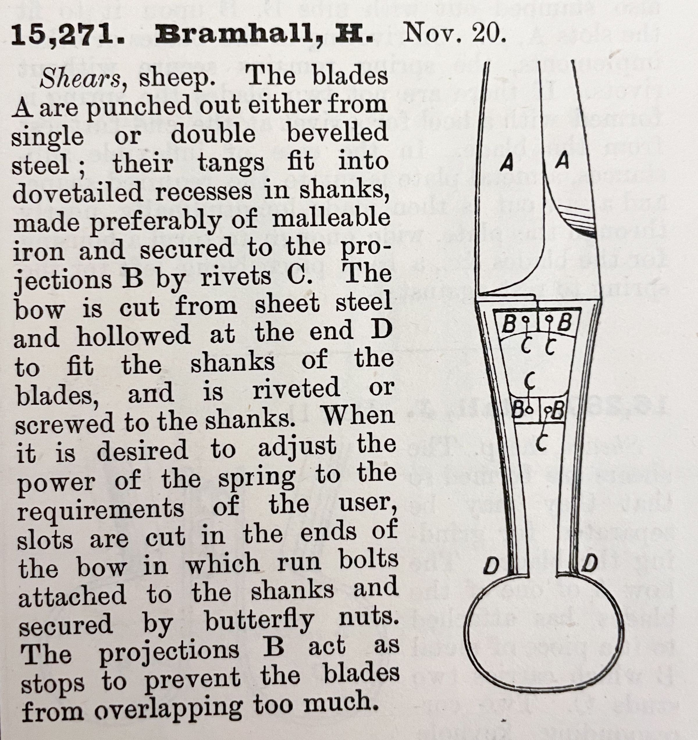 Shears, sheep. The blades A are punched out either from single or double bevelled steel; their tangs fit into dovetailed recesses in shanks, made preferably of malleable iron and secured to the projections B by rivets C. The bow is cut from sheet steel and hollowed at the end D to fit the shanks of the blades, and is riveted or screwed to the shanks. When it is desired to adjust the power of the spring to the requirements of the user, slots are cut in the ends of the bow in which run bolts attached to the shanks and secured by butterfly nuts. The projections B act as stops to prevent the blades from overlapping too much.Cataloged By