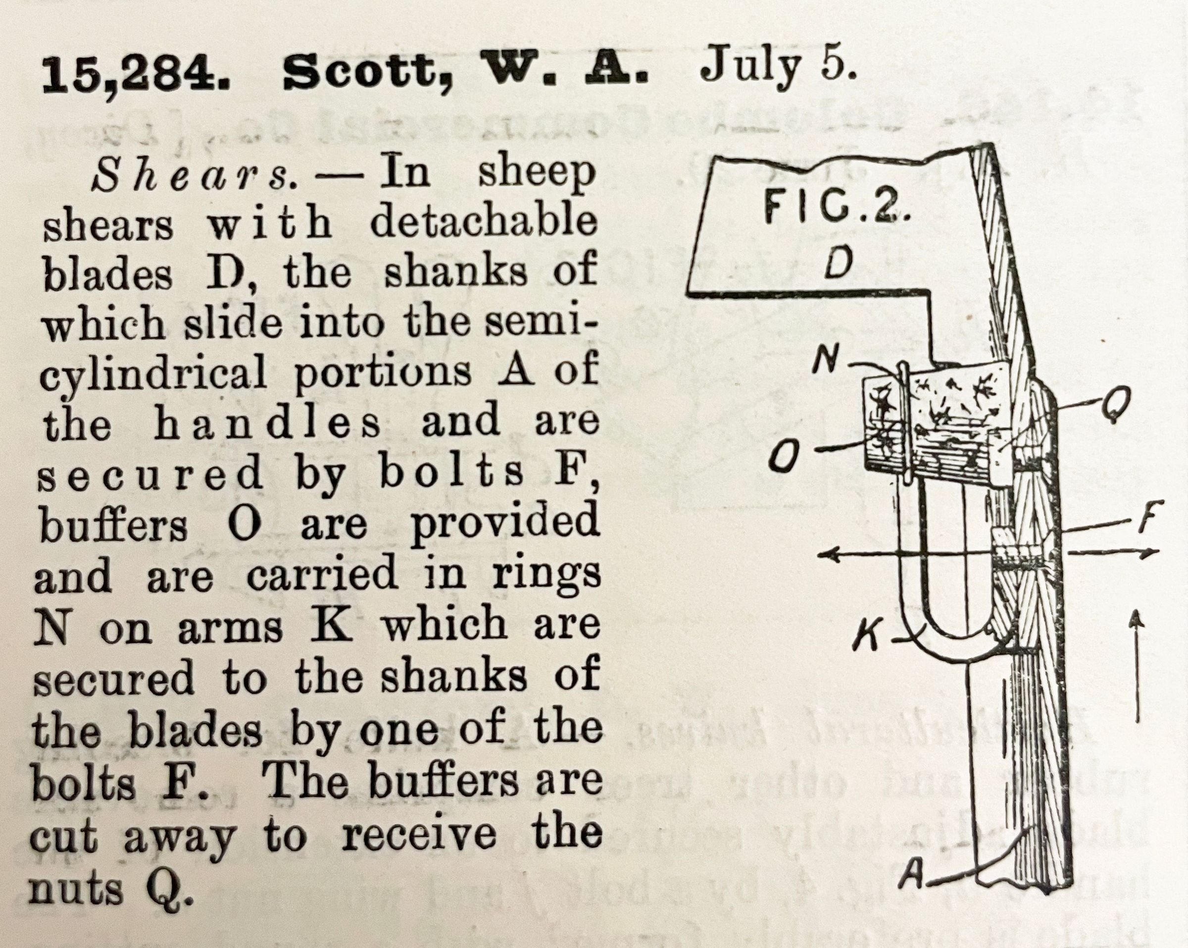 Shears. -- In sheep shears with detachable blades D, the shanks of which slide into the semi-cylindrical portions A of the handles and are secured by bolts F, buffers O are provided and are carried in rings N on arms K which are secured to the shanks of the blades by one of the bolts F. The buffers are cut away to receive the nuts Q.Cataloged By