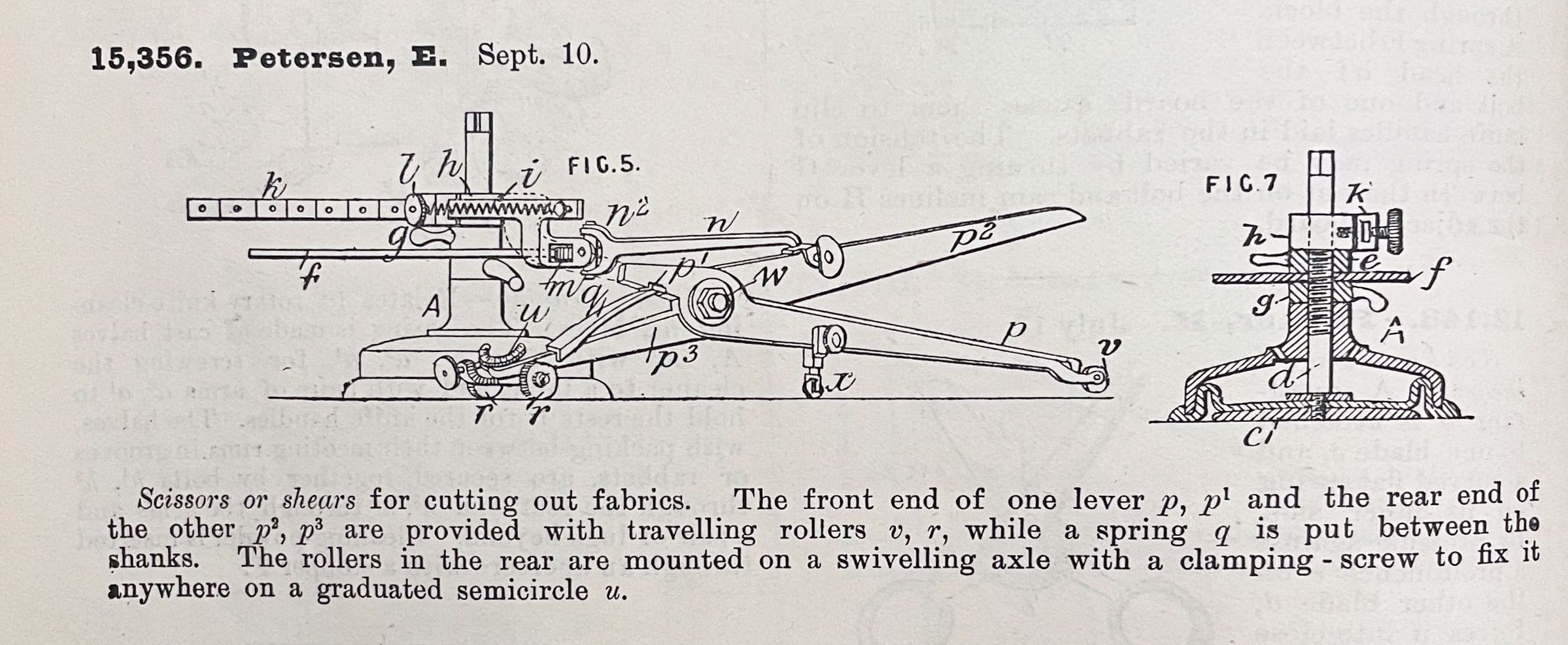 Scissors or shears for cutting out fabrics. The front end of one lever p, p1 and the rear end of the other p2, p3 are provided with travelling rollers v, r, while a spring q is put between the shanks. The roles in the rear are mounted on a swivelling axle with a clamping-screw to fix it anywhere on a graduated semicircle u.Cataloged By