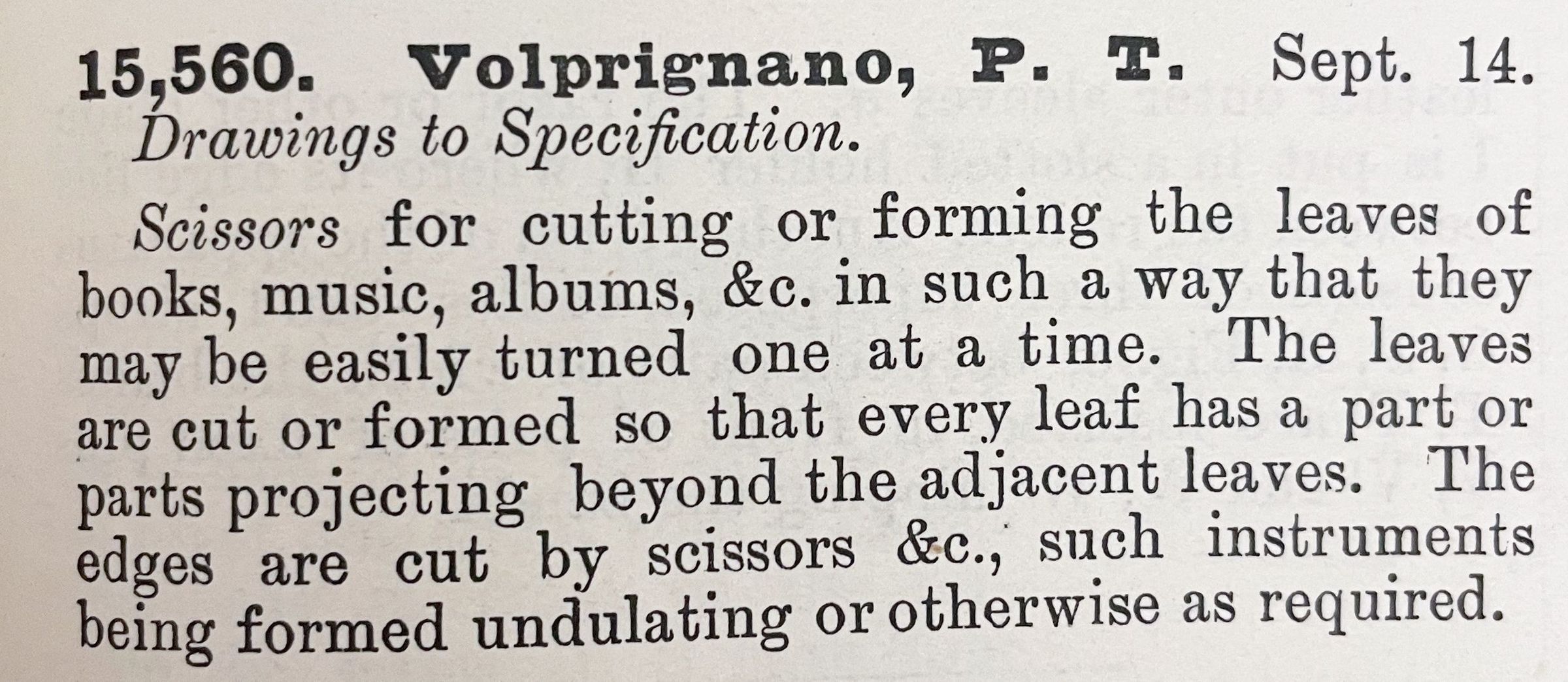 Scissors for cutting or forming the leaves of books, music, albums, &c. in such a way that they may be easily turned one at a time. The leaves are cut or formed so that every leaf has a part of parts projecting beyond the adjacent leaves. The edges are cut by scissors &c., such instruments being formed undulating or otherwise as required.Cataloged By