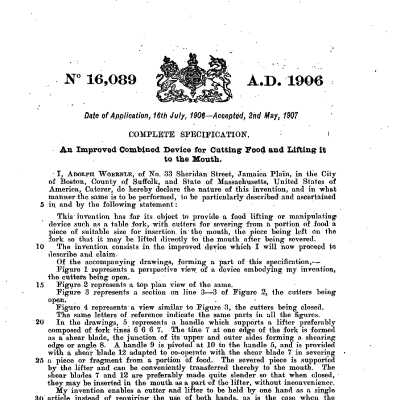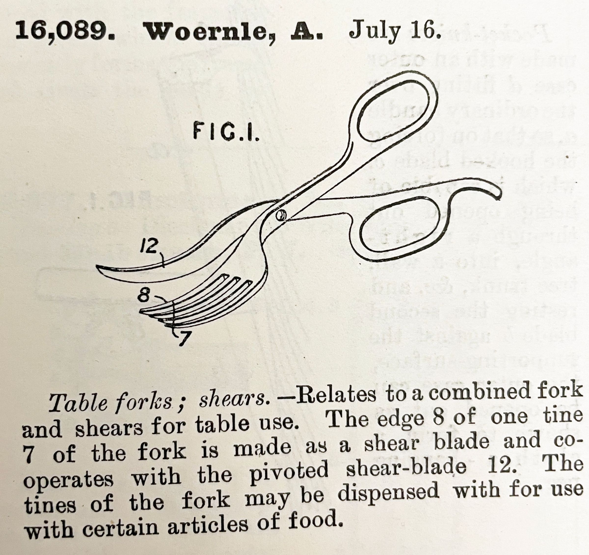 Table forks; shears. -- Relates to a combined fork and shears for table use. The edge 8 of one tine 7 of the fork is made as a shear blade and cooperates with the pivoted shear-blade 12. The tines of the fork may be dispensed with for use with certain articles of food.Relationships