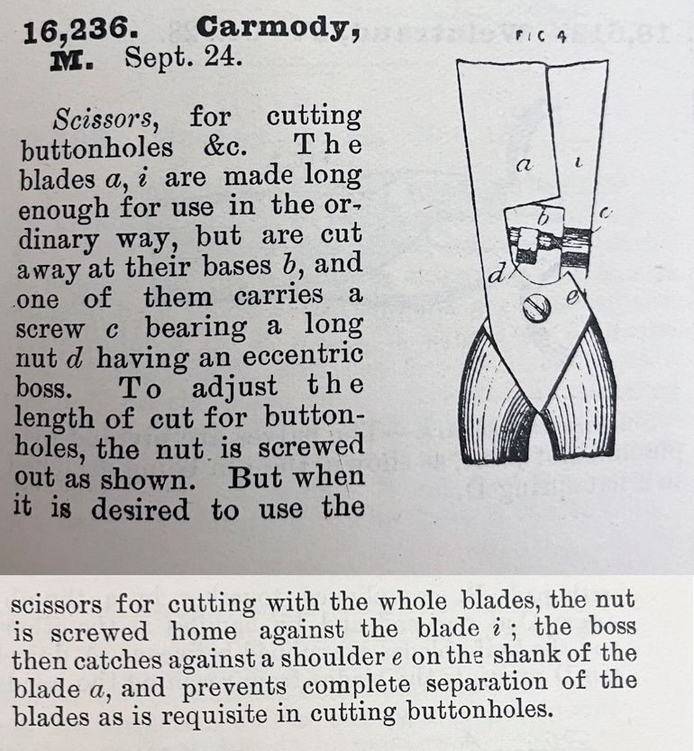 Scissors, for cutting buttonholes &c. The blades a, i are made long enough for use in the ordinary way, but are cut away at their bases b, and one of them carries a screw c bearing a long nut d having an eccentric boss. To adjust the length of cut for button-holes, the nut is screwed out as shown. But when it is desired to use the scissors for cutting with the whole blades, the nut is screwed home against the blade i; the boss then catches against a shoulder e on the shank of the blade a, and prevents complete separation of the blades as is requisite in cutting buttonholes.Cataloged By