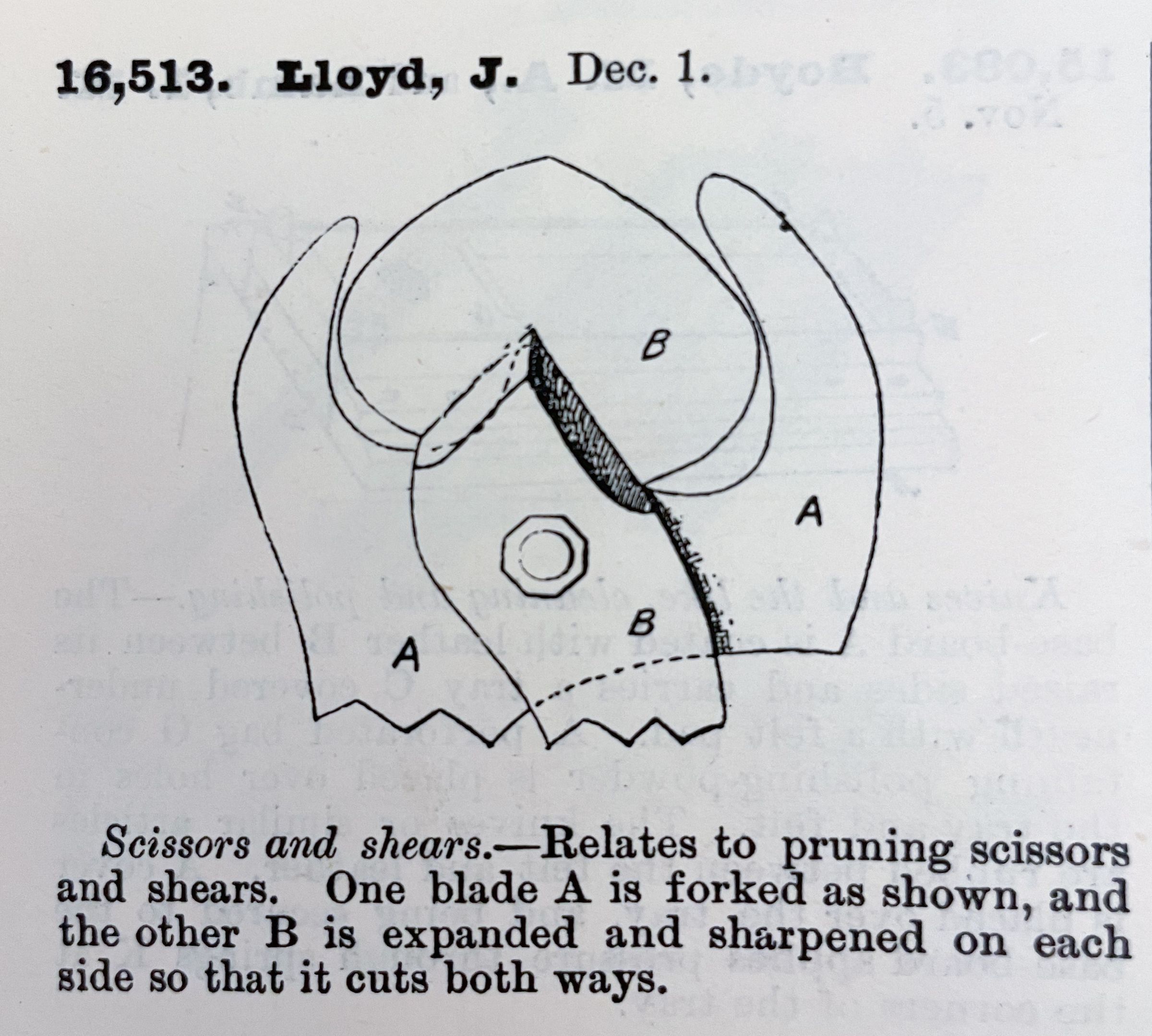 Scissors and shears. -- Relates to pruning scissors and shears. One blade A is forked as shown, and the other B is expanded and sharpened on each side so that it cuts both ways.Cataloged By