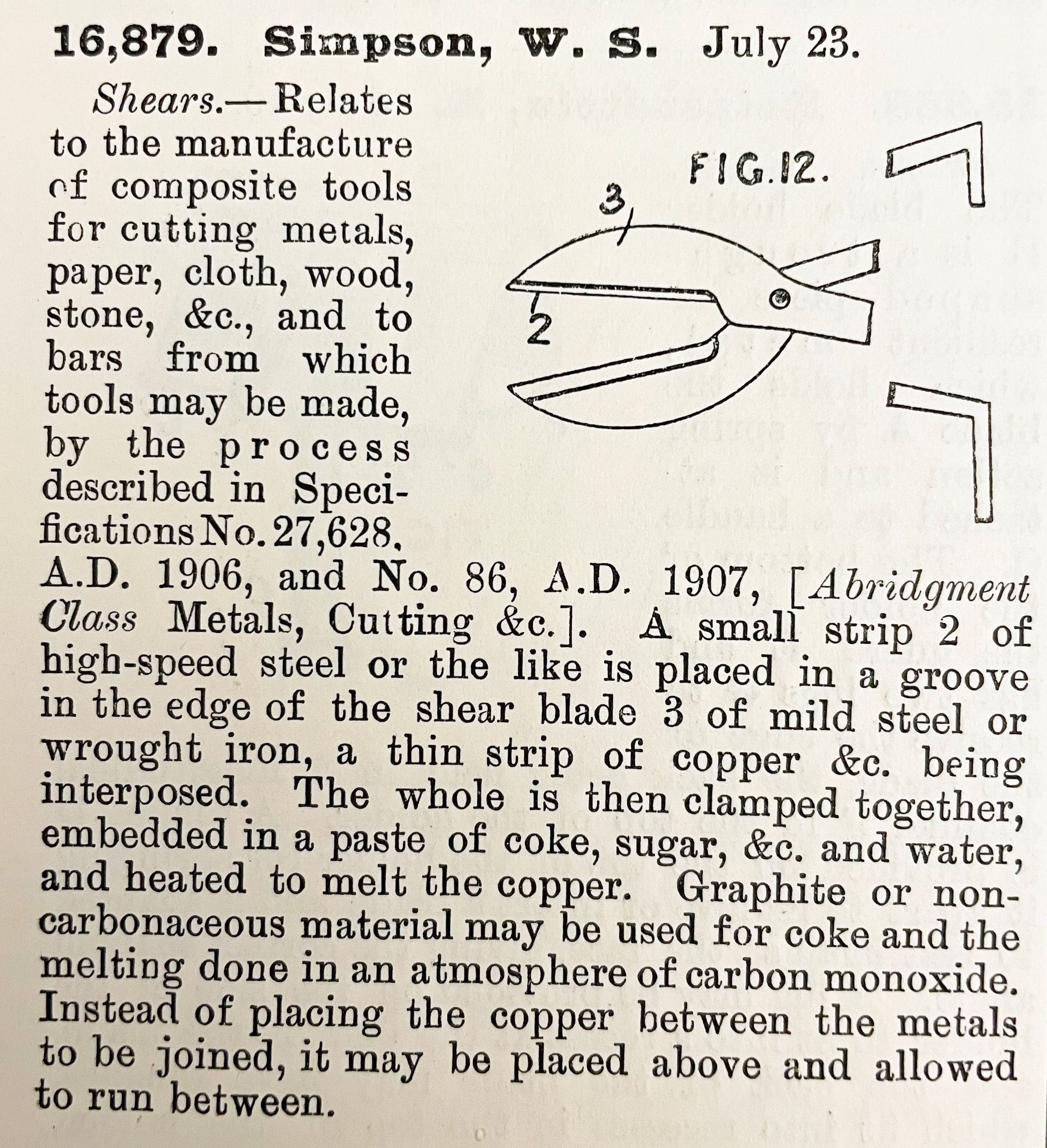 Shears. -- Relates to the manufacture of composite tools for cutting metals, paper, cloth, wood, stone, &c., and to bars from which tools may be made, by the process described in Specifications No. 27,628, A.D. 1906, and No. 86, A.D. 1907, [Abridgement Class Metals, Cutting &c.]. A small strip 2 of high-speed steel or the like is placed in a groove in the edge of the shear blade 3 of mild steel or wrought iron, a thin strip of copper &c. being interposed. The whole is then clamped together, embedded in a paste of coke, sugar, &c. and water, and heated to melt the copper. Graphite or non-carbonaceous material may be used for coke and the melting done in an atmosphere pf carbon monoxide. Instead of placing the copper between the metals to be joined, it may be placed above and allowed to run between.Cataloged By