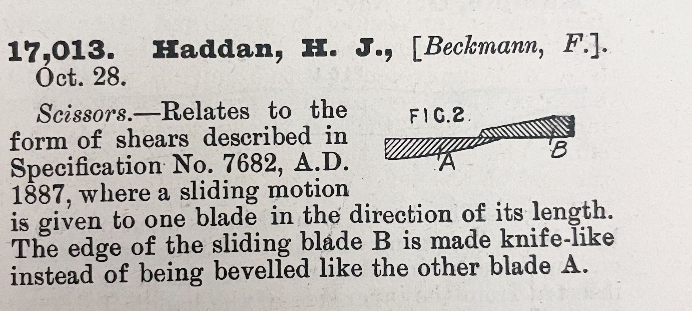 Scissors. -- Relates to the form of shears described in Specification No. 7682, A.D. 1887, where a sliding motion is given to one blade in the direction of its length. The edge of the sliding blade B is made knife-like instead of being bevelled like the other blade A.Cataloged By