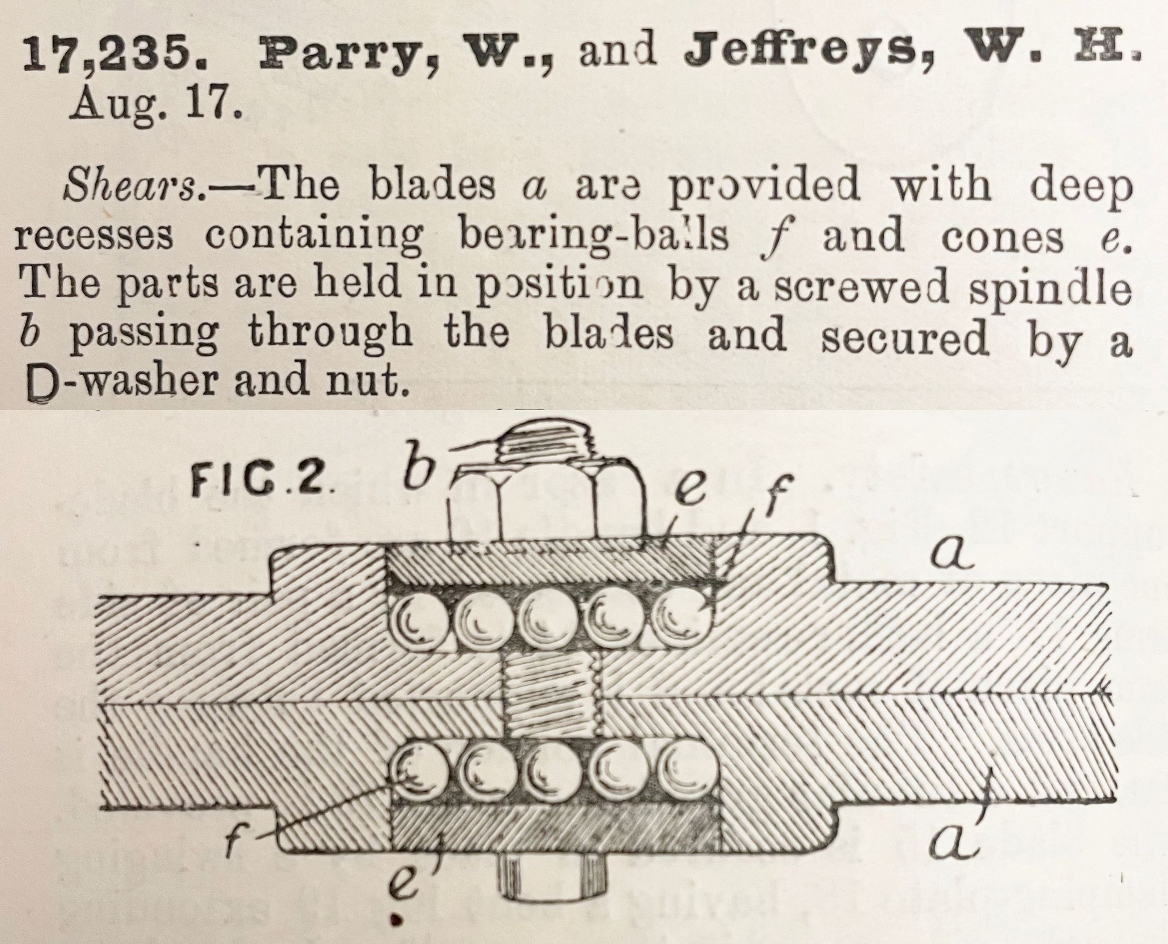 Shears. -- The blades an are provided with deep recesses containing bearing-balls f and cones e. The parts are held in position by a screwed spindle b passing though the blades and secured by a D-washer and nut.Cataloged By