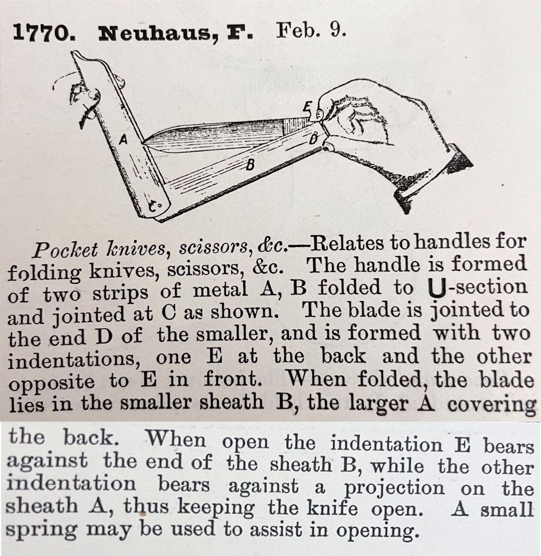Pocket knives, scissors, &c. -- Relates to handles for folding knives, scissors, &c. The handle is formed of two strips of metal A, B folded to U-section and jointed at C as shown. The blade is jointed to the end D of the smaller, and is formed with two indentations, one E at the back and the other opposite to E in front. When folded, the blade lies in the smaller sheath B, the larger A covering the back. When open the indentation E bears against the end of the sheath B, while the other indentation bears against a projection on the sheath A, thus keeping the knife open. A small spring may be used to assist in opening.Cataloged By