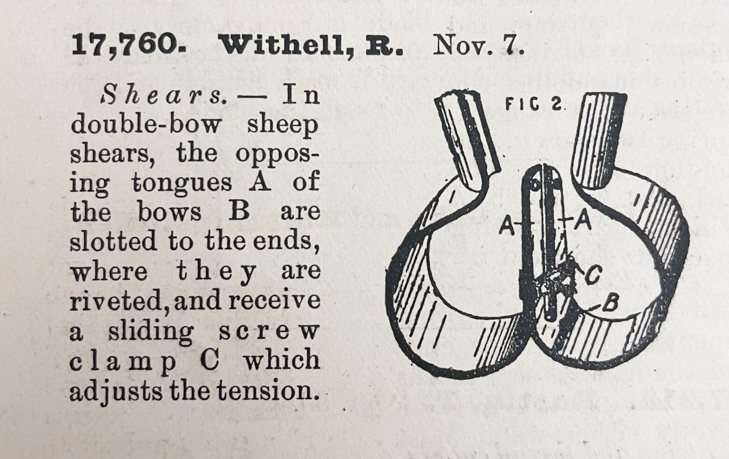 Shears. -- In double-bow sheep shears, the opposing tongues A of the bows B are slotted to the ends, where they are riveted, and receive a sliding screw clamp C which adjusts the tension.Relationships