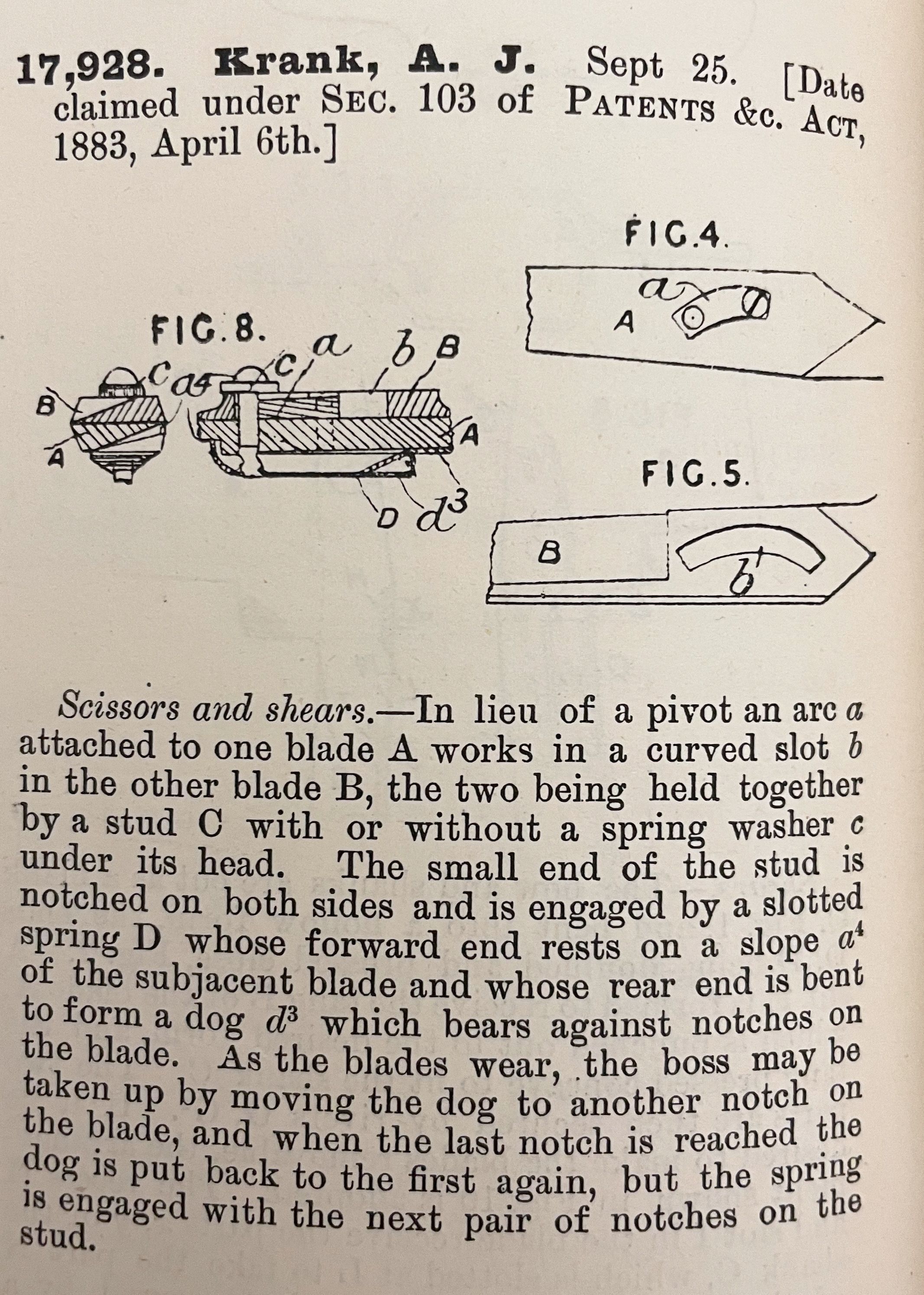 Scissors and shears. -- In lieu of a pivot an arc a attached to one blade A works in a curved slot b in the other blade B, the two being held together by a stud C with or without a spring washer c under its head. The small end of the stud is notched on both sides and is engaged by a slotted spring D whose forward end rests on a slope a4 of the subjacent blade and whose rear end is bent to form a dog d3 which bears against notches on the blade. As the blades wear, the boss may be taken up by moving the dog to another notch on the blade, and when the last notch is reached the dog is put back to the first again, but the spring is engaged with the next pair of notches on the stud.Cataloged By
