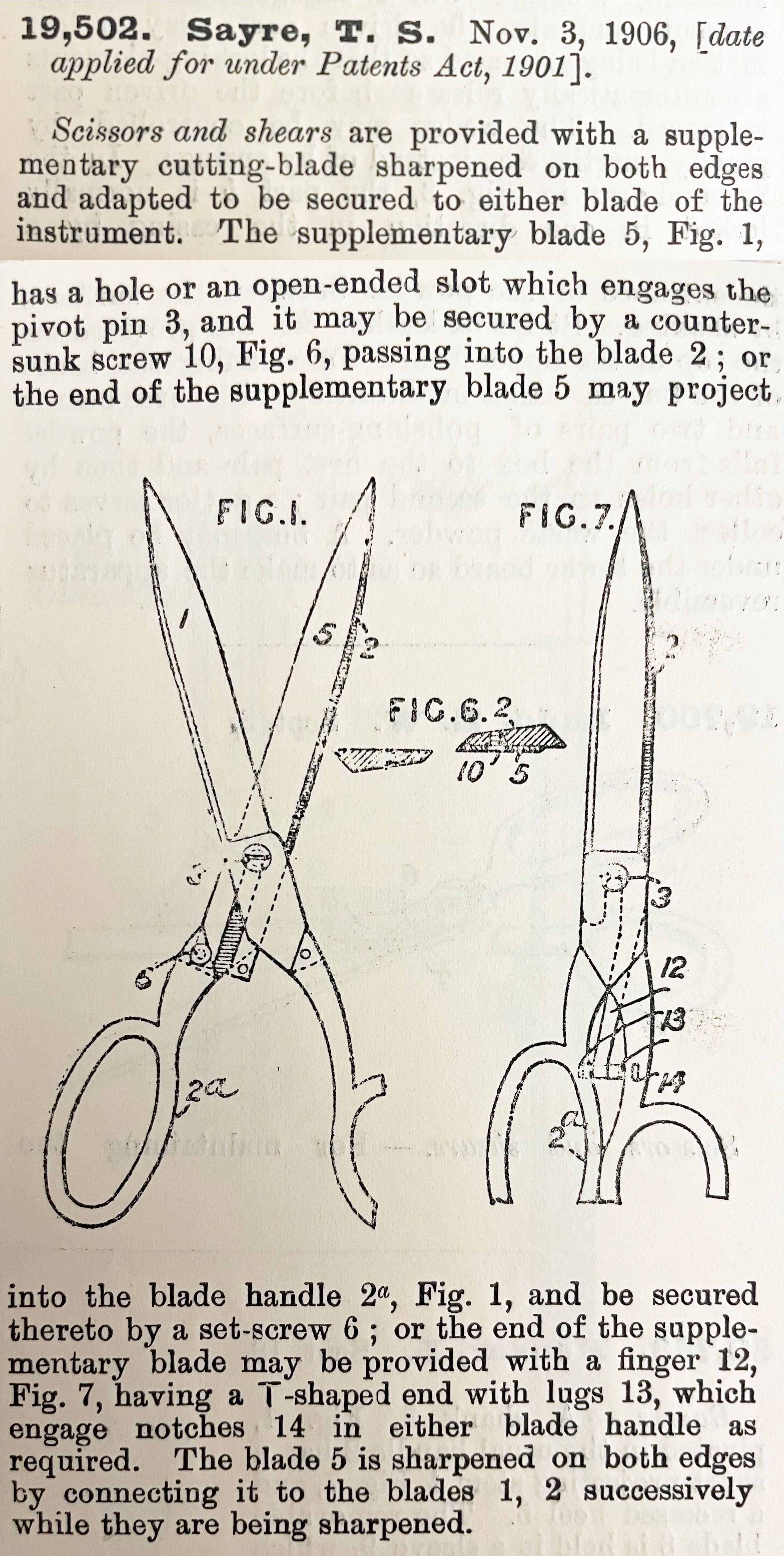 Scissors and shears are provided with a supplementary cutting-blade sharpened on both edges and adapted to be secured to either blade of the instrument. The supplementary blade 5, Fig. 1, has a hole or an open-ended slot which engages the pivot pin 3, and it may be secured by a counter-sunk screw 10, Fig. 6, passing into the blade 2; or the end of the supplementary blade 5 may project into the handle 2a, Fig. 1, and be secured thereto by a set-screw 6; or the end of the supplementary blade may be provided with a finger 12, Fig. 7, having a T-shaped end with lugs 13, which engage notches 14 in either blade handle as required. The blade 5 is sharpened on both edges by connecting it to the blades 1, 2 successively while they are being sharpened.Cataloged By