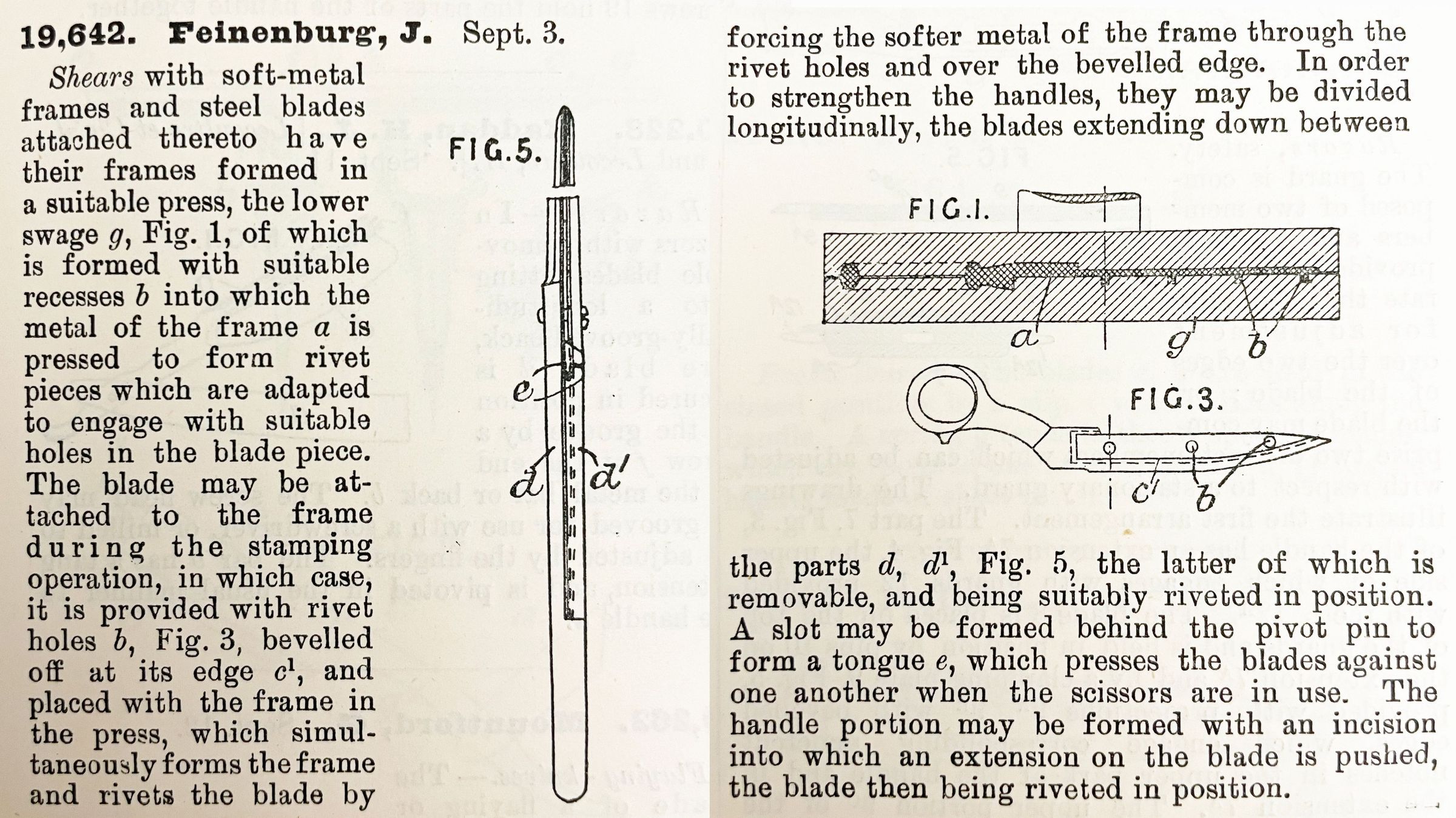 Shears with soft-metal frames and steel blades attached thereto have their frames formed in a suitable press, the lower swage g, Fig. 1, of which is formed with suitable recesses b into which the metal of the frame a is pressed to form rivet pieces which are adapted to engage with suitable holes in the blade piece. The blade may be attached to the frame during the stamping operation, in which case, it is provided with rivet holes b, Fig. 3, bevelled off at its edge c1, and placed with the frame in the press, which simultaneously forms the frame and rivets the blade by forcing the softer metal of the frame through the rivet holes and over the bevelled edge. In order to strengthen the handles, they may be divided longitudinally, the blades extending down between the parts d, d1, Fig. 5, the latter of which is removable, and being suitably riveted in position. A slot may be formed behind the pivot pin to form a tongue e, which presses the blades against one another when the scissors are in use. The handle portion may be formed with an incision into which an extension on the blade is pushed, the blade then being riveted in position.Cataloged By