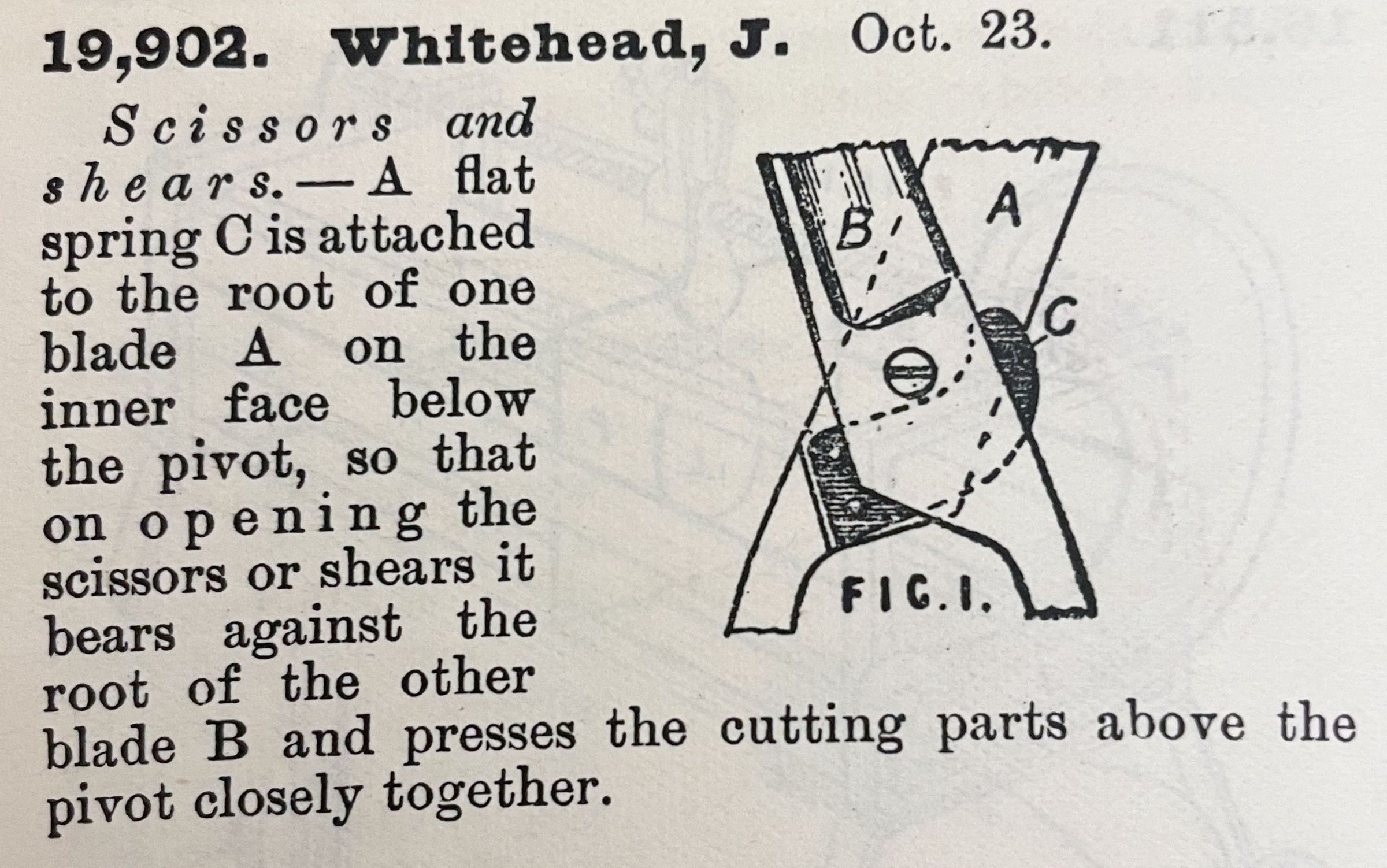 Scissors and shears. -- A flat spring C is attached to the root of one blade A on the inner face below the pivot, so that on opening the scissors or shears it bears against the root of the other blade B and presses the cutting parts above the pivot closely together.Cataloged By