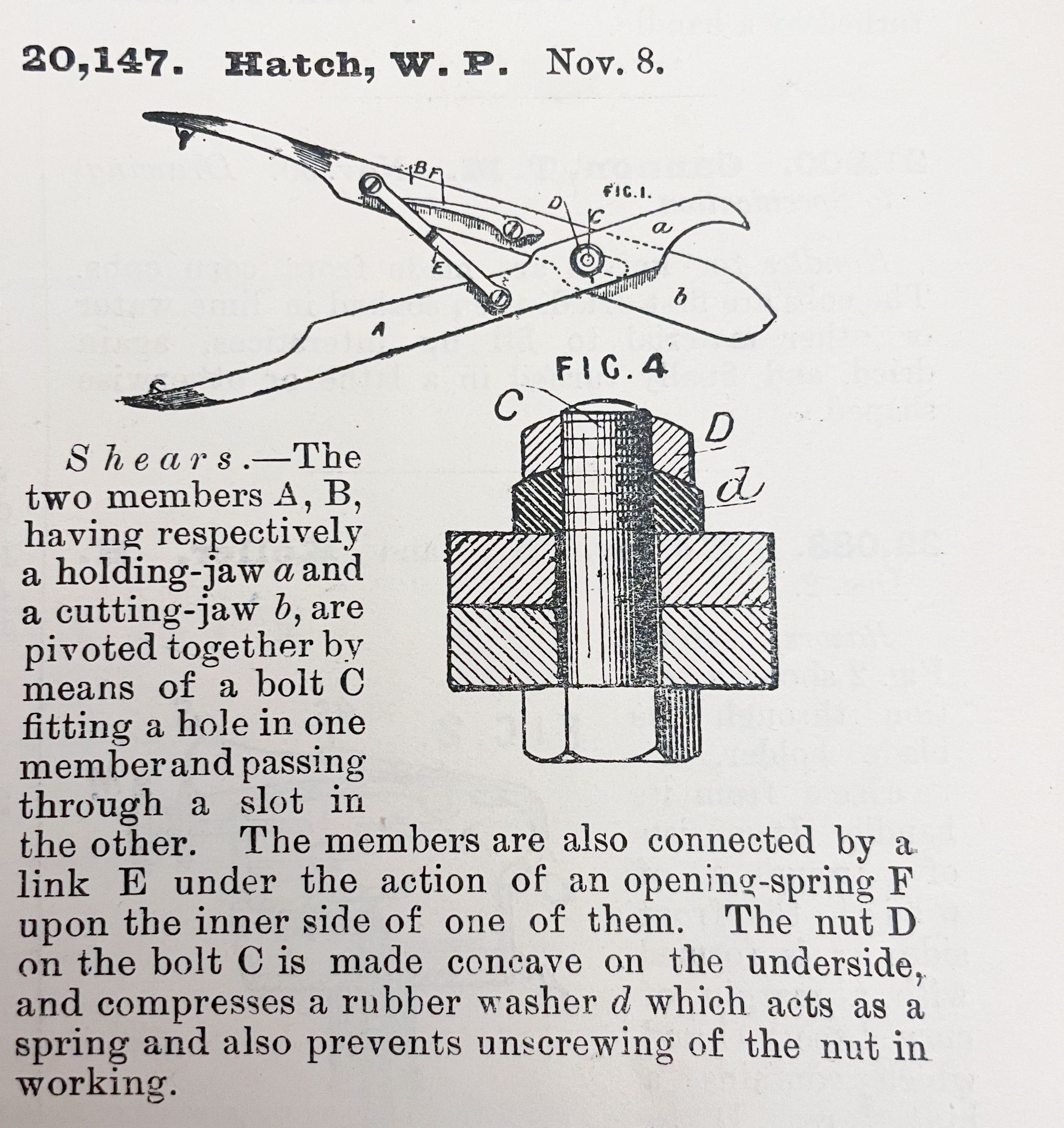 Shears. -- The two members A, B, having respectively a holding-jaw a and a cutting-jaw b, are pivoted together by means of a bolt C fitting a hole in one member and passing through a slot in the other. The members are also connected by a link E under the action of an opening-spring F upon the inner side of one of them. The nut D on the bolt C is made concave on the underside, and compresses a rubber washer d which acts as a spring and also prevents unscrewing of the nut in working.Cataloged By