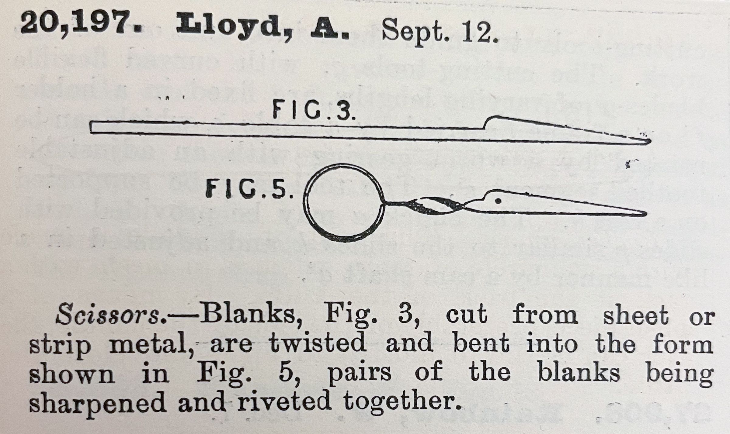 Scissors. -- Blanks, Fig. 3, cut from sheet or strip metal, are twisted and bent into the form shown in Fig. 5, pairs of the blanks being sharpened and riveted together.Cataloged By