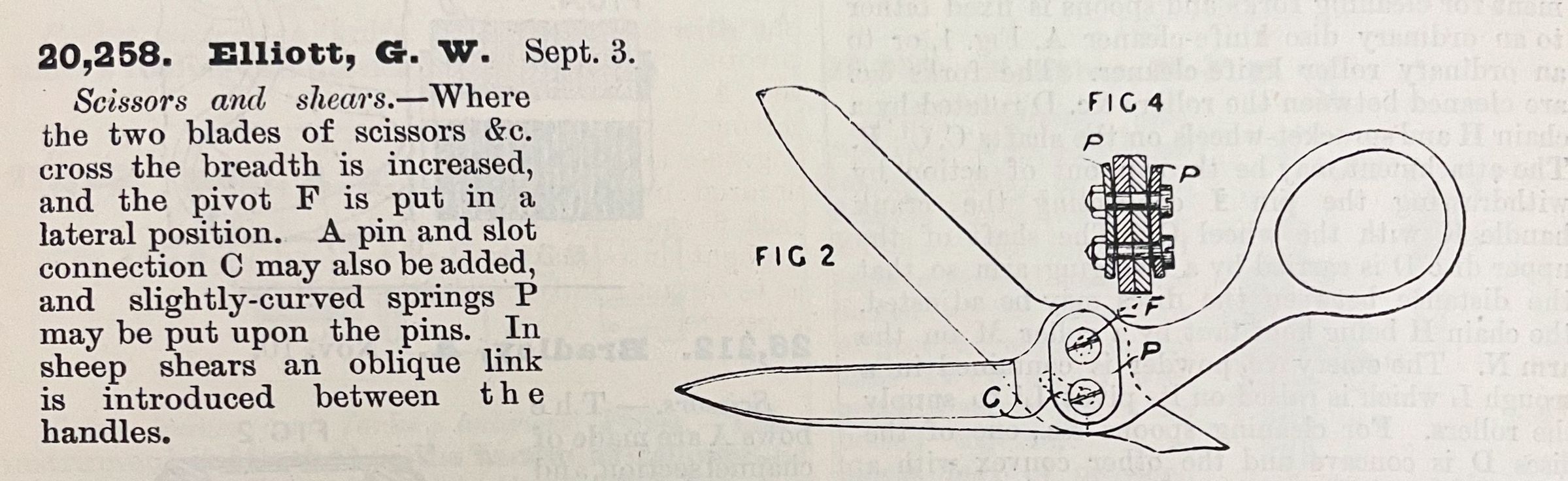 Scissors and shears. -- Where the two blades of scissors &c. cross the breadth is increased, and the pivot F is put in a lateral position. A pin and slot connection C may also be added, and slightly-curved springs P may be put upon the pins. In sheep shears an oblique link is introduced between the handles.Cataloged By