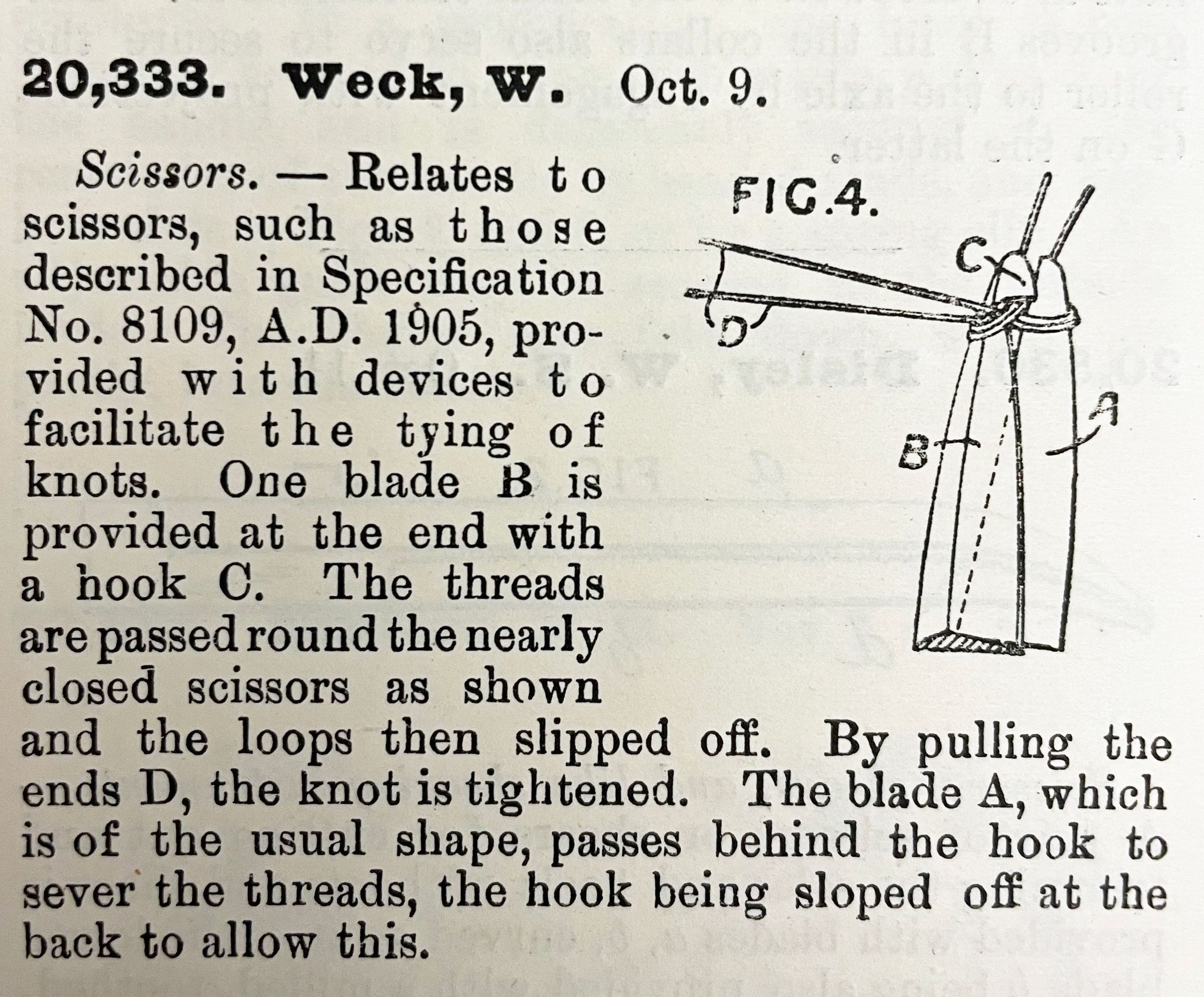 Scissors. -- Relates to scissors, such as those described in Specification No. 8109, A.D. 1905, provided with devices to facilitate the tying of knots. One blade B is provided at the end with a hook C. The threads are passed round the nearly closed scissors as shown and the loops then slipped off. By pulling the ends D, the knot is tightened. The blade A, which is of the usual shape, passes behind the hook to sever the threads, the hook being sloped off at the back to allow this.Cataloged By