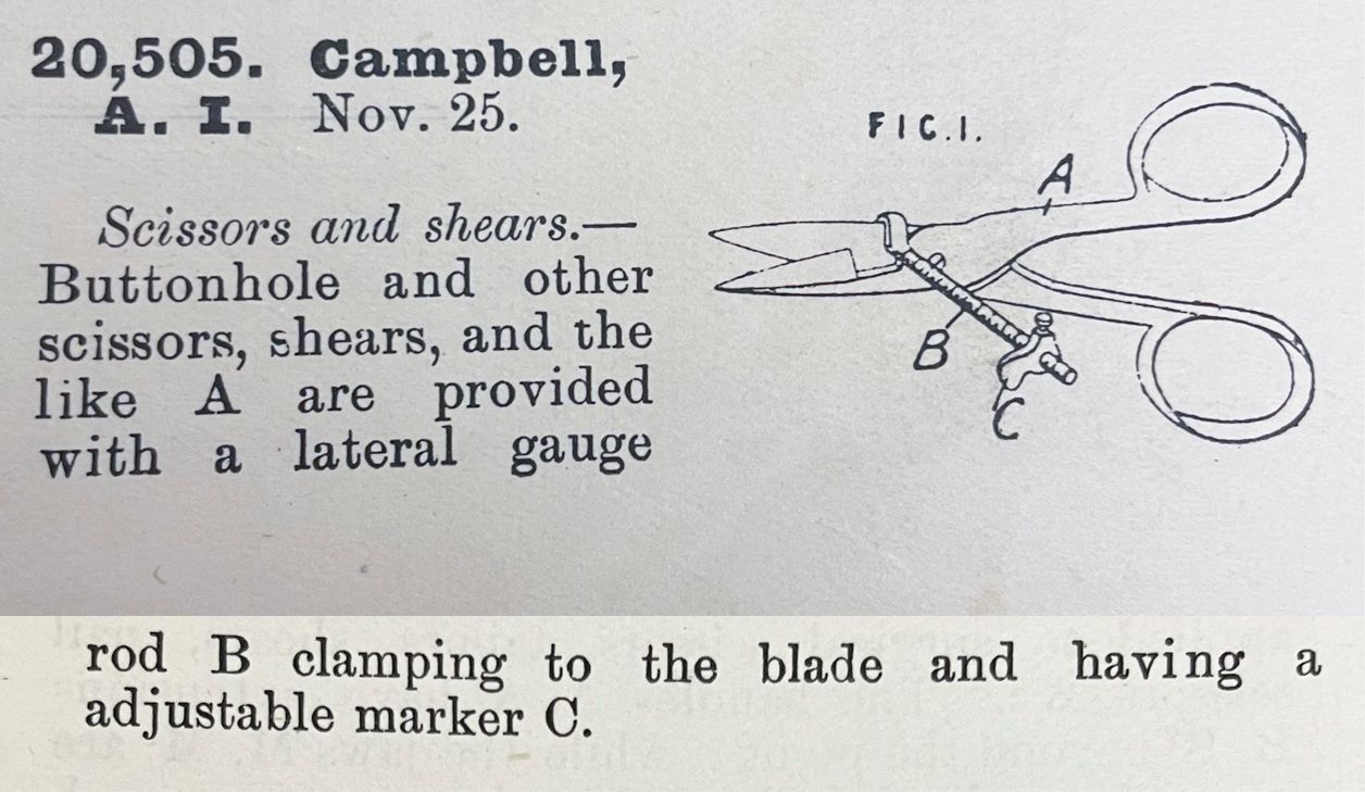 Scissors and shears. -- Buttonhole and other scissors, shears, and the like A are provided with a lateral gauge rod B clamping to the blade and having a adjustable marker C.Cataloged By