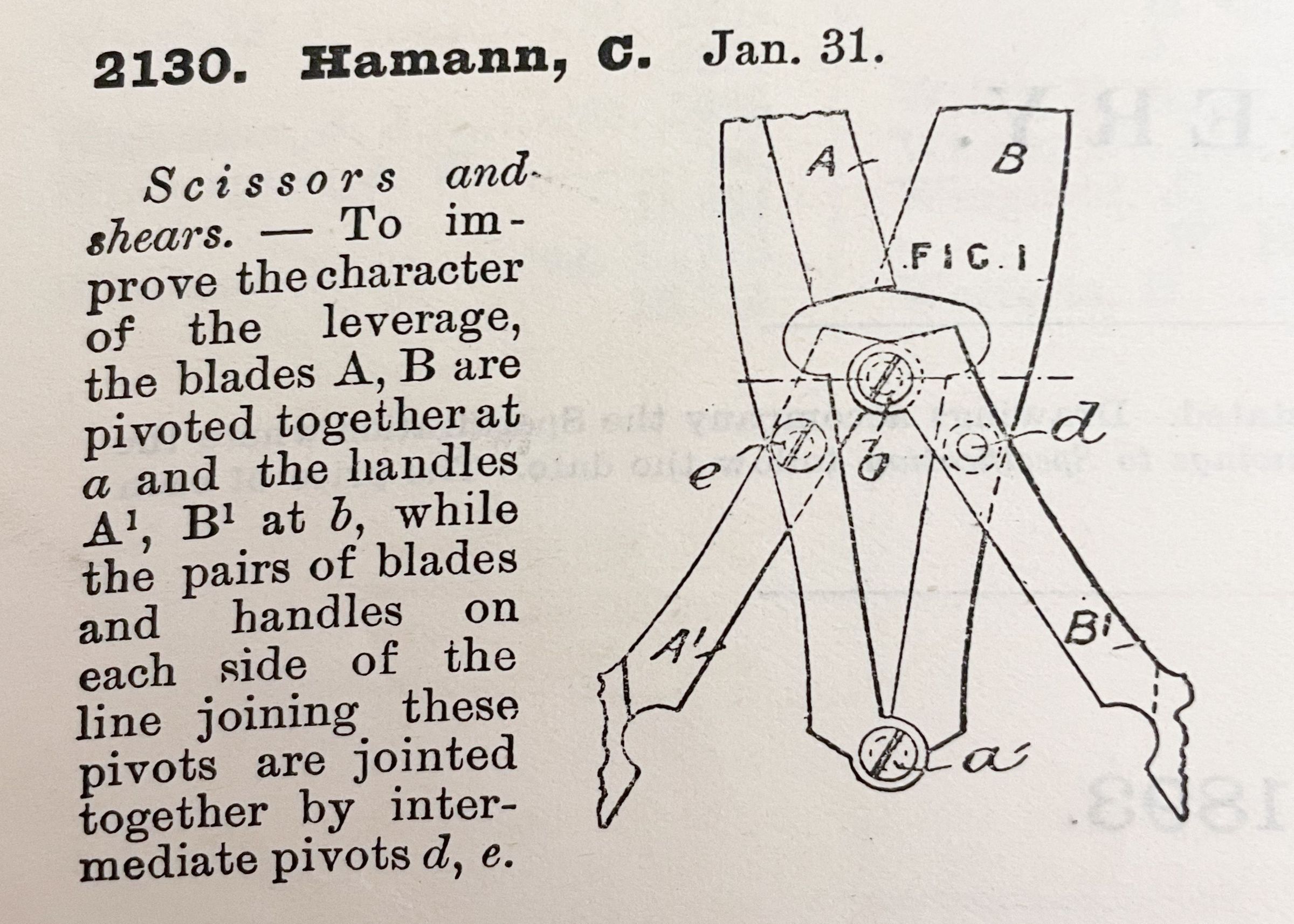 Scissors and shears. -- To improve the character of the leverage, the blades A, B are pivoted together at a and the handles A1, B1 at b, while the pairs of blades and handles on each side of the line joining these pivots are jointed together by intermediate pivots d, e.Cataloged By