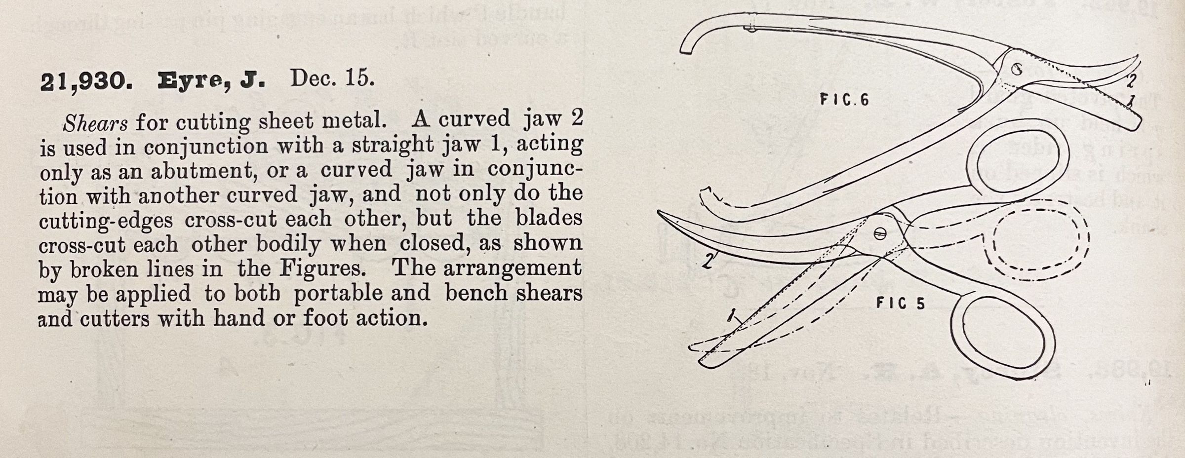 Shears for cutting sheet metal. A curved jaw 2 is used in conjunction with a straight jaw 1, acting only as an abutment, or a curved jaw in conjunction with another curved jaw, and not only of the cutting-edges cross-cut each other, but the blades cross-cut each other bodily when closed, as shown by broken lines in the Figures. The arrangement may be applied to both portable and bench shears and cutters with hand or foot action.Cataloged By
