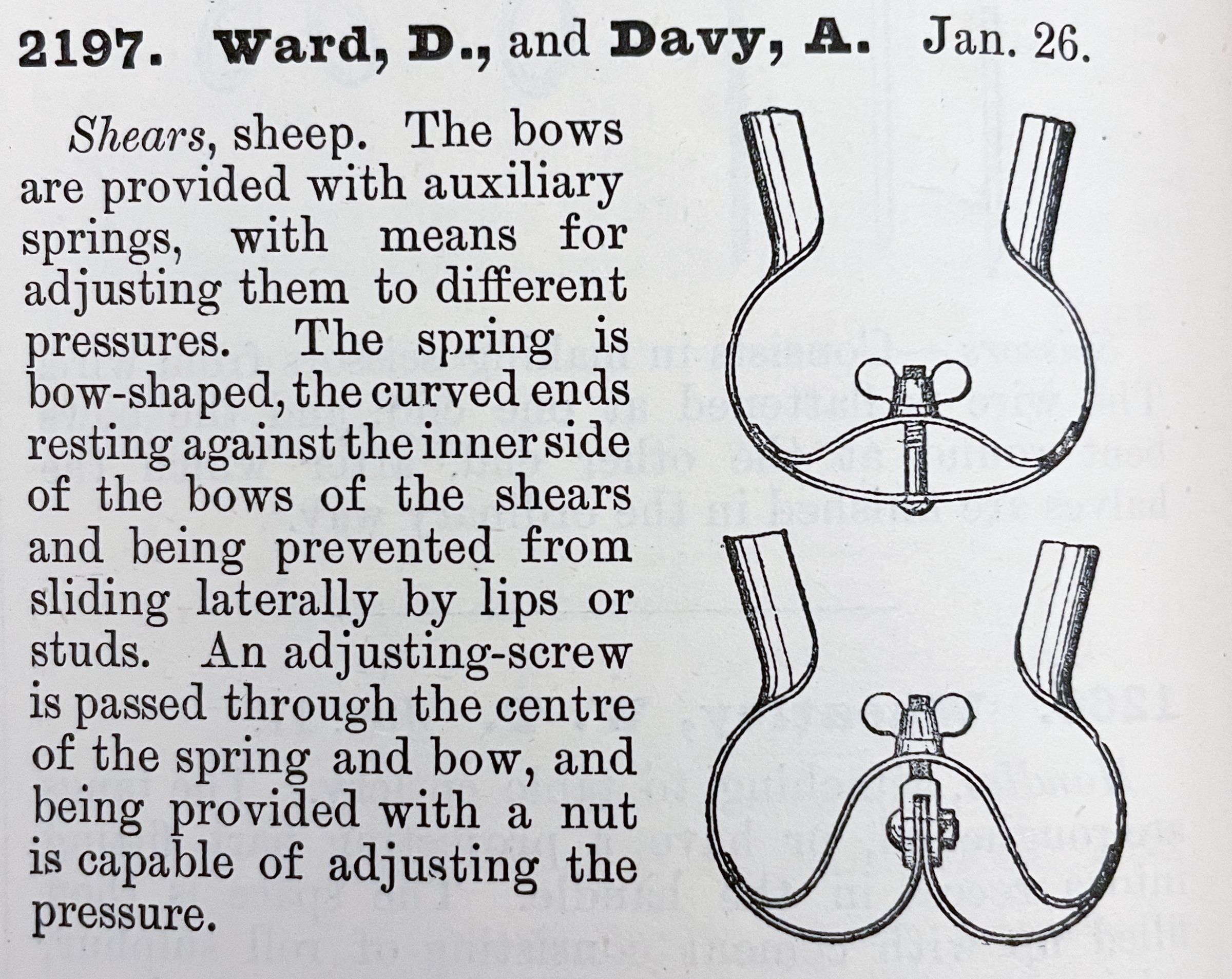 Shears, sheep. The bows are provided with auxiliary springs, with means for adjusting them to different pressures. The spring is bow-shaped, the curved ends resting against the inner side of the bows of the shears and being prevented from sliding laterally by lips or studs. An adjusting-screw is passed through the centre of the spring and bow, and being provided with a nut is capable of adjusting the pressure.Cataloged By