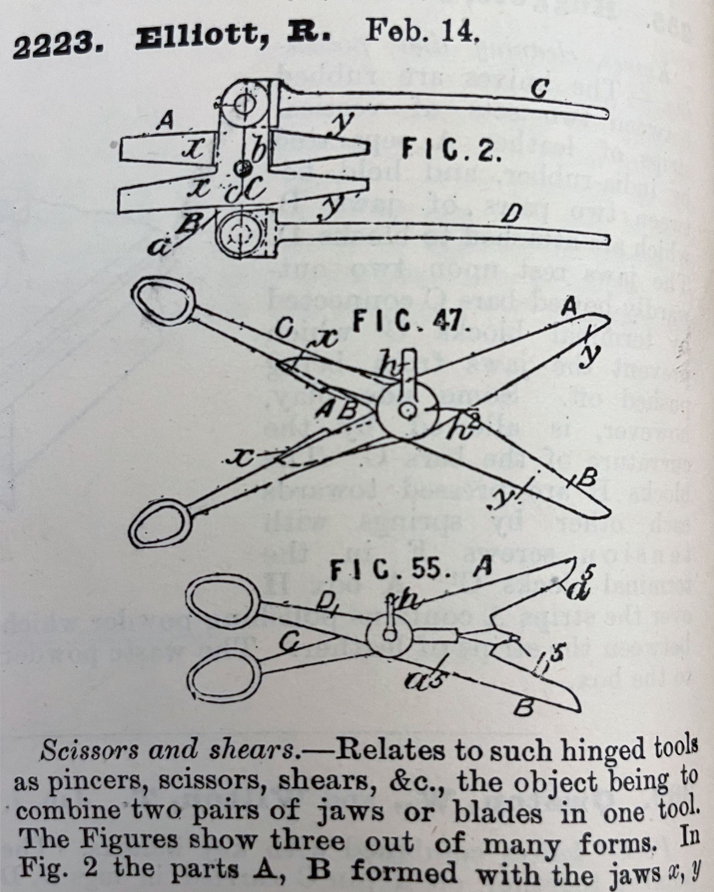 Scissors and shears. -- Relates to such hinged tools as pincers, scissors, shears, &c., the object being to combine two pairs of jaws or blades in one tool. The Figures show three out of many forms. In Fig. 2 the parts A, B formed with the jaws x, y [incomplete?].Cataloged By