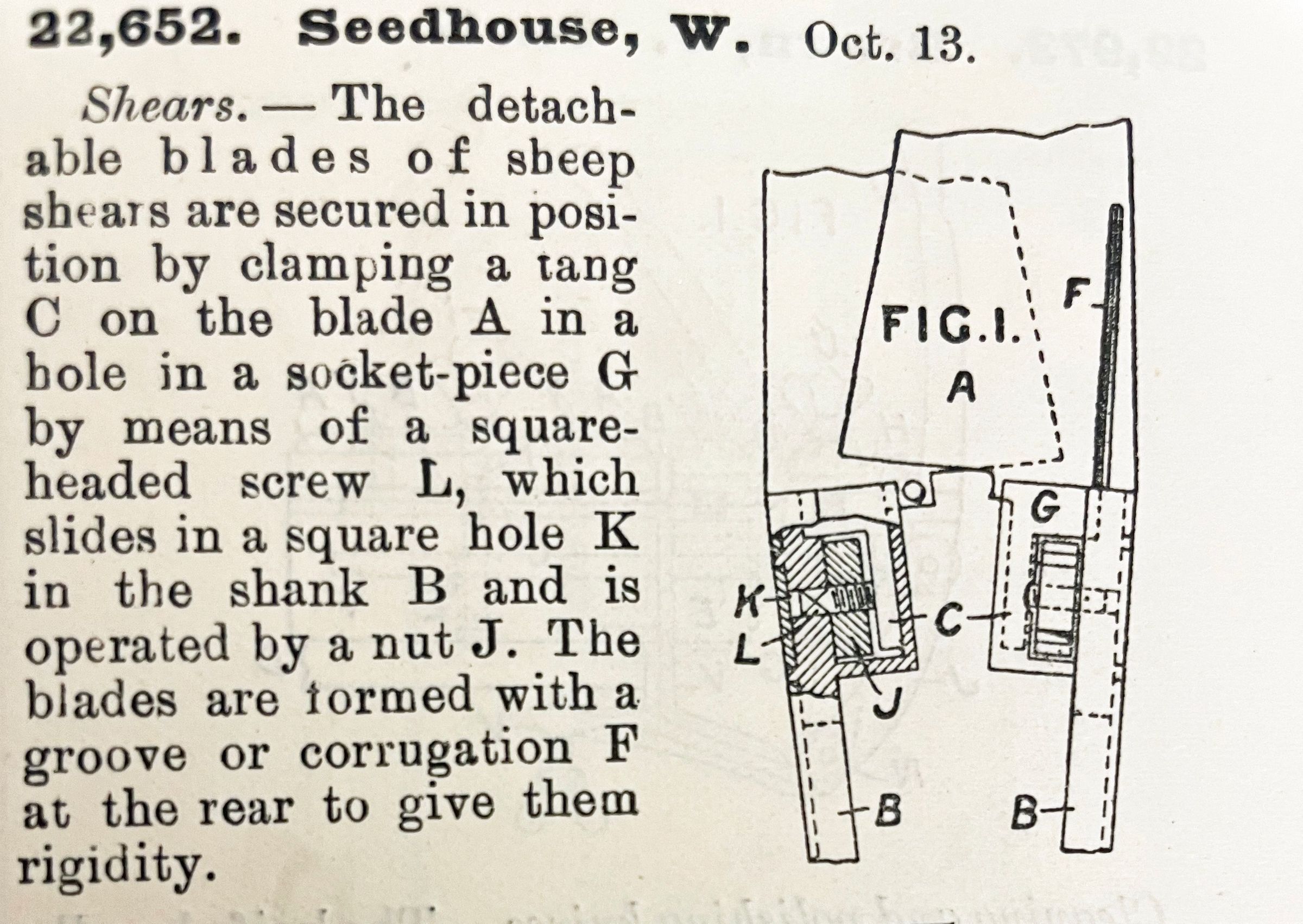 Shears. -- The detachable blades of sheep shears are secured in position by clamping a tang C on the blade A in a hole in a socket-piece G by means of a square-headed screw L, which slides in a square hole K in the shank B and is operated by a nut J. The blades are formed with a groove or corrugation F at the rear to give them rigidity.Cataloged By