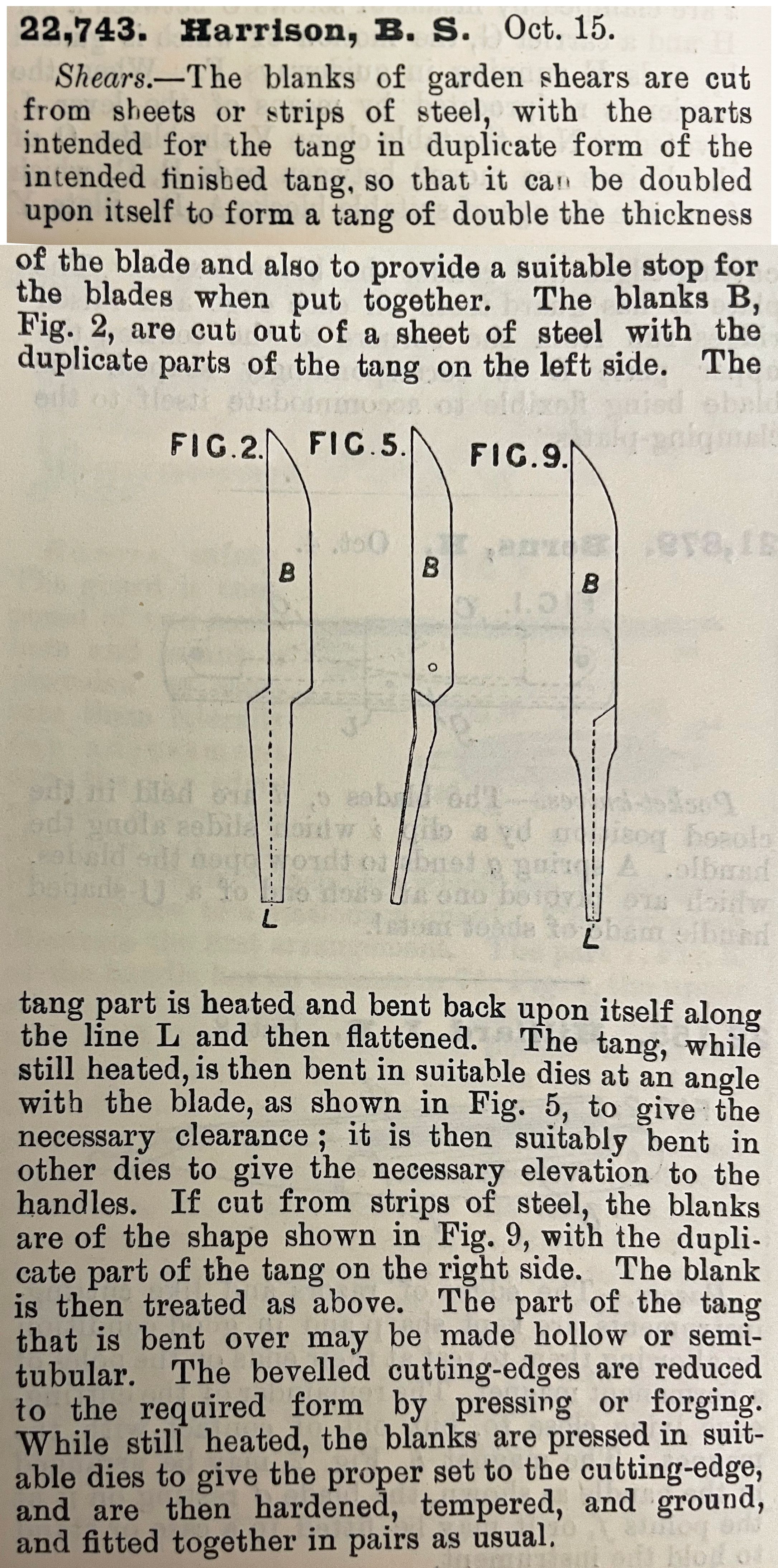 Shears. -- The blanks of garden shears are cut from sheets or strips of steel, with the parts intended for the tang in duplicate form of the intended finished tang, so that it can be doubled upon itself to form a tang of double the thickness of the blade and also to provide a suitable stop for the blades when put together. The blanks B, Fig. 2. are cut out of a sheet of steel with the duplicate parts of the tang on the left side. The tang part is heated and bent back upon itself along the line L and then flattened. The tang, while still heated, is then bent in suitable dies at an angle with the blade, as shown in Fig. 5, to give the necessary clearance; it is then suitably bent in other dies to give the necessary elevation to the handles. If cut from strips of steel, the blanks are of the shape shown in Fig. 9, with the duplicate part of the tang on the right side, The blank is then treated as above. The part of the tang that is bent over may be made hollow or semi-tubular. The bevelled cutting-edges are reduced to the required form by pressing or forging. While still heated, the blanks are pressed in suitable dies to give the proper set to the cutting-edge, and are then hardened, tempered, and ground, and fitted together in pairs as usual.Cataloged By