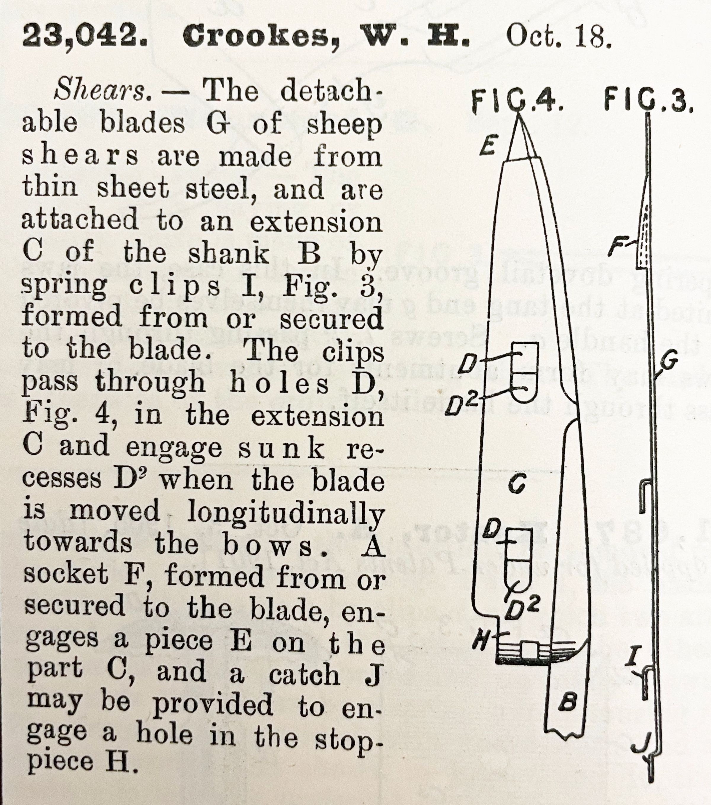 Shears. -- The detachable blades G of sheep shears are made from thin sheet steel, and are attached to an extension C of the shank B by spring clips I, Fig. 3, formed from or secured to the blade. The clips pass through holes D, Fig. 4, in the extension C and engage sunk recesses D2 when the blade is moved longitudinally towards the bows. A socket F, formed from or secured to the blade, engages a piece E on the part C, and a catch J may be provided to engage a hole in the stop-piece H.Cataloged By