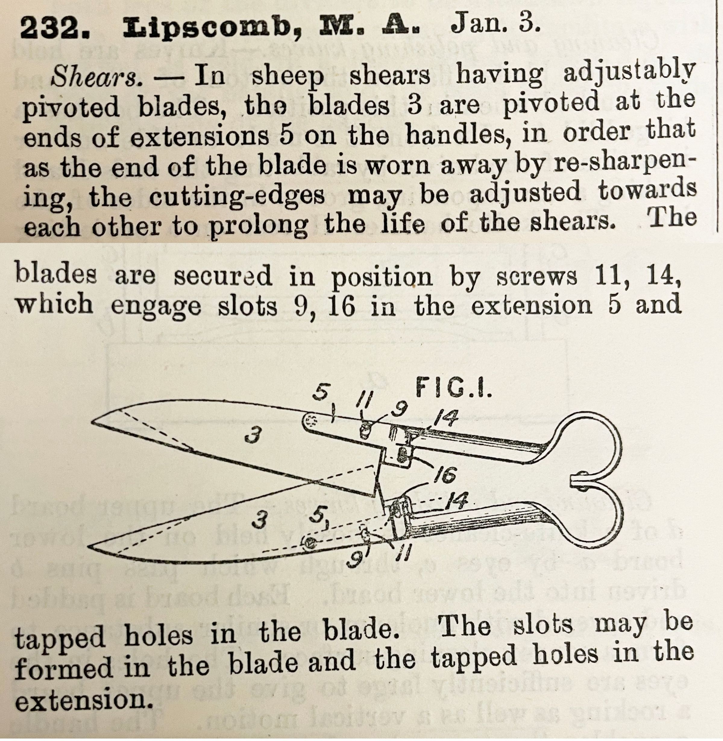 Shears. -- In sheep shears having adjustably pivoted blades, the blades 3 are pivoted at the ends of extensions 5 on the handles, in order that as the end of the blade is worn away by re-sharpening, the cutting-edges may be adjusted towards each other to prolong the life of the shears. The blades are secured in position by screws 11, 14 which engage slots 9, 16 in the extension 5 and tapped holes in the blade. The slots may be formed in the blade and the tapped holes in the extension.Cataloged By