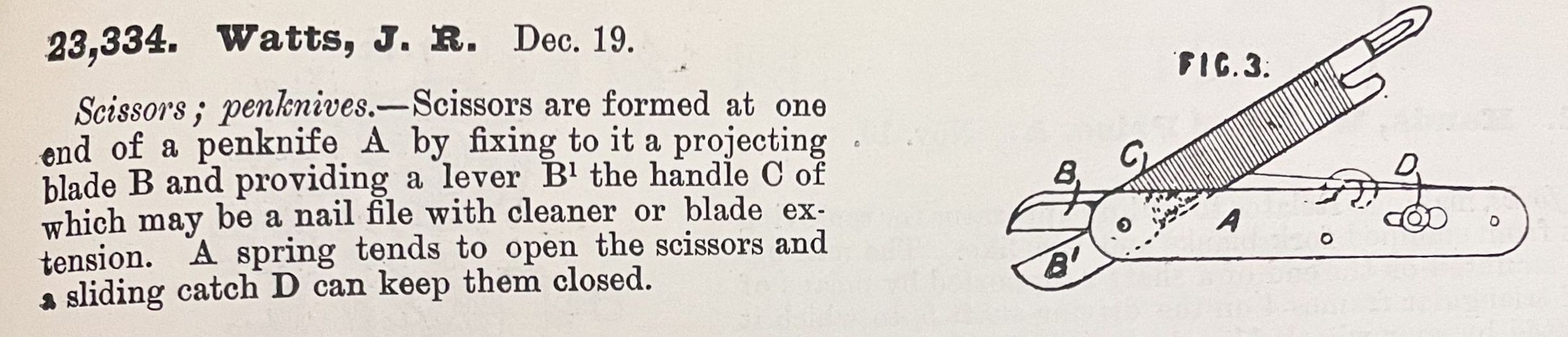 Scissors; penknives. -- Scissors are formed at one end of a penknife A by fixing to it a projecting blade B and providing a lever B1 the handle C of which may be a nail file with cleaner or blade extension. A spring tends to open the scissors and a sliding catch D can keep them closed.Cataloged By