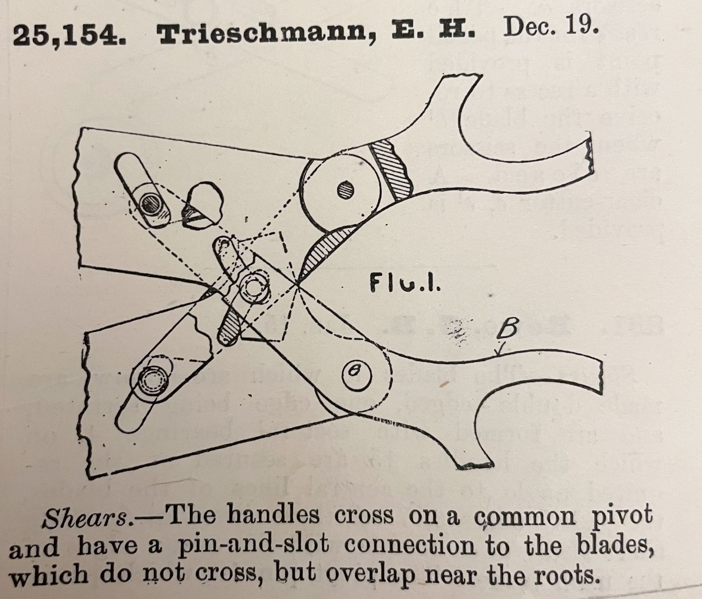Shears. -- The handles cross on a common pivot and have a pin-and-slot connection to the blades, which do not cross, but overlap near the roots.Cataloged By