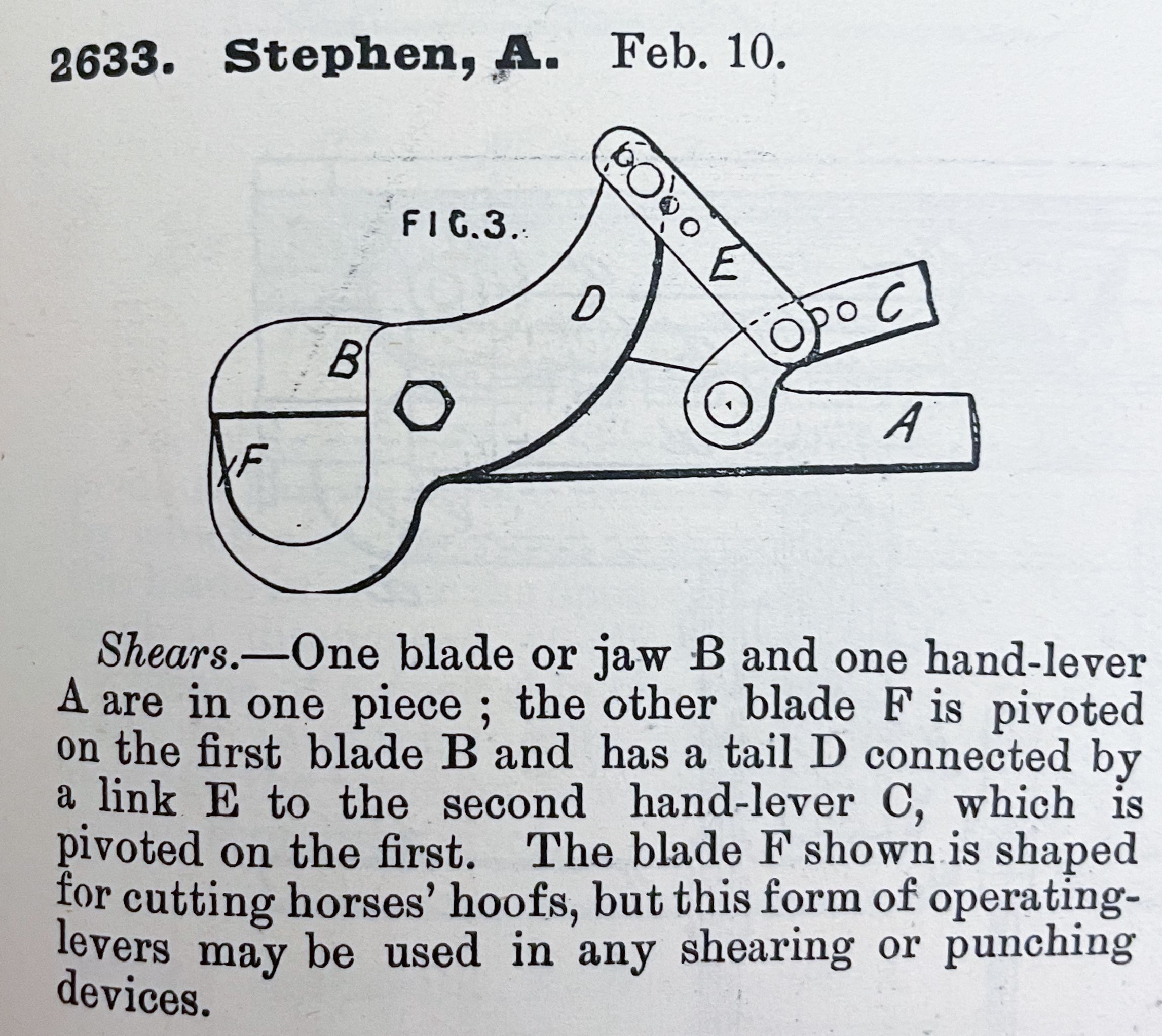 Shears. -- One blade or jaw B and one hand-lever A are in one piece; the other blade F is pivoted on the first blade B and has a tail D connected by a link E to the second hand-lever C, which is pivoted on the first. The blade F shown is shaped for cutting horses' hoofs, but this form of operating-levers may be used in any shearing or punching devices.Cataloged By