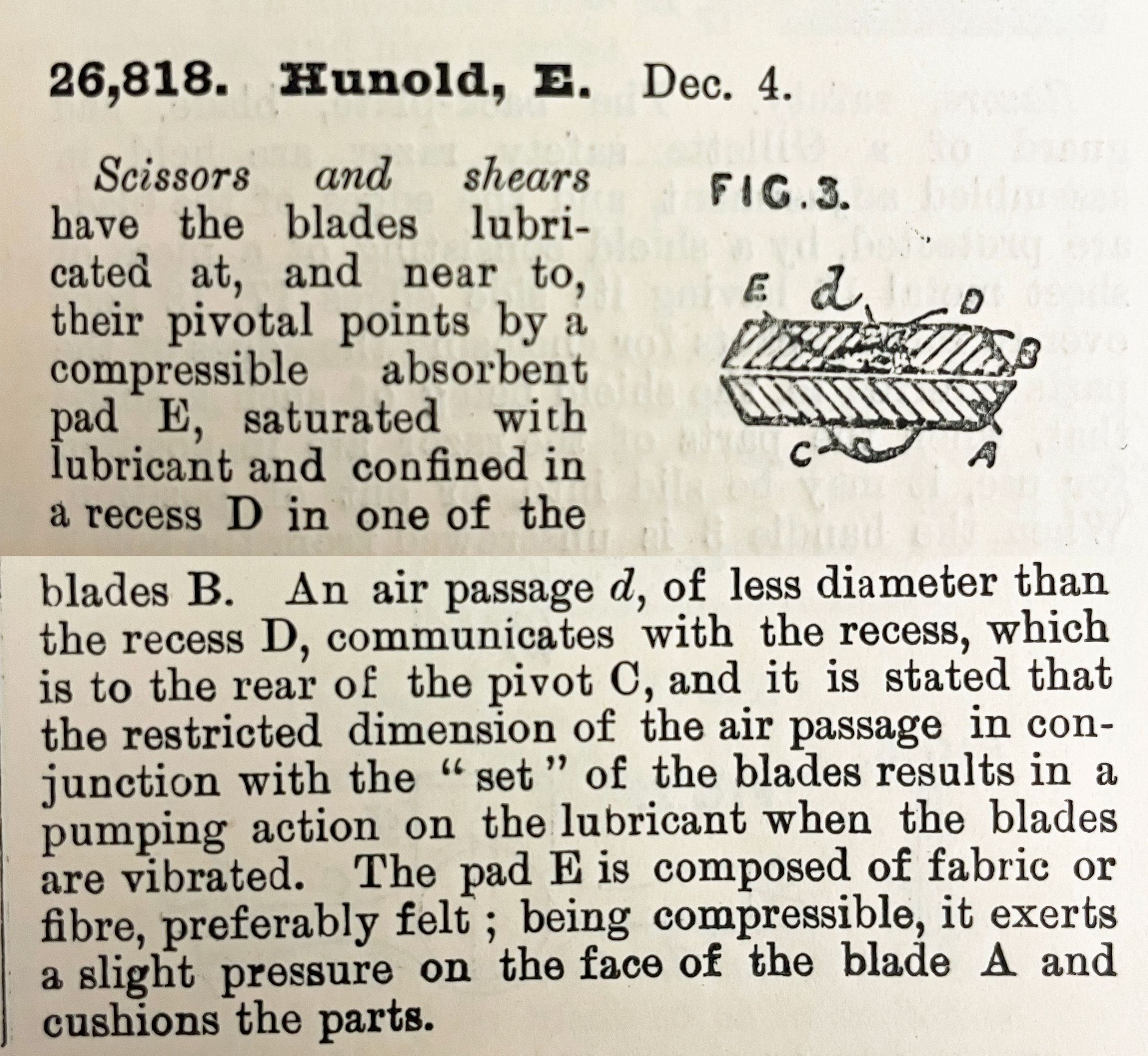 Scissors and shears have the blades lubricated at, and near to, their pivotal points by a compressible absorbent pad E, saturated with lubricant and confined in a recess D in one of the blades B. An air passage d, of less diameter than the recess D, communicates with the recess, which is to the rear of the pivot C, and it is stated that the restricted dimension of the air passage in conjunction with the "set: of the blades results in a pumping action on the lubricant when the blades are vibrated. The pad E is composed of fabric or fibre, preferably felt; being compressible, it exerts a slight pressure on the face of the blade A and cushions the parts.Cataloged By