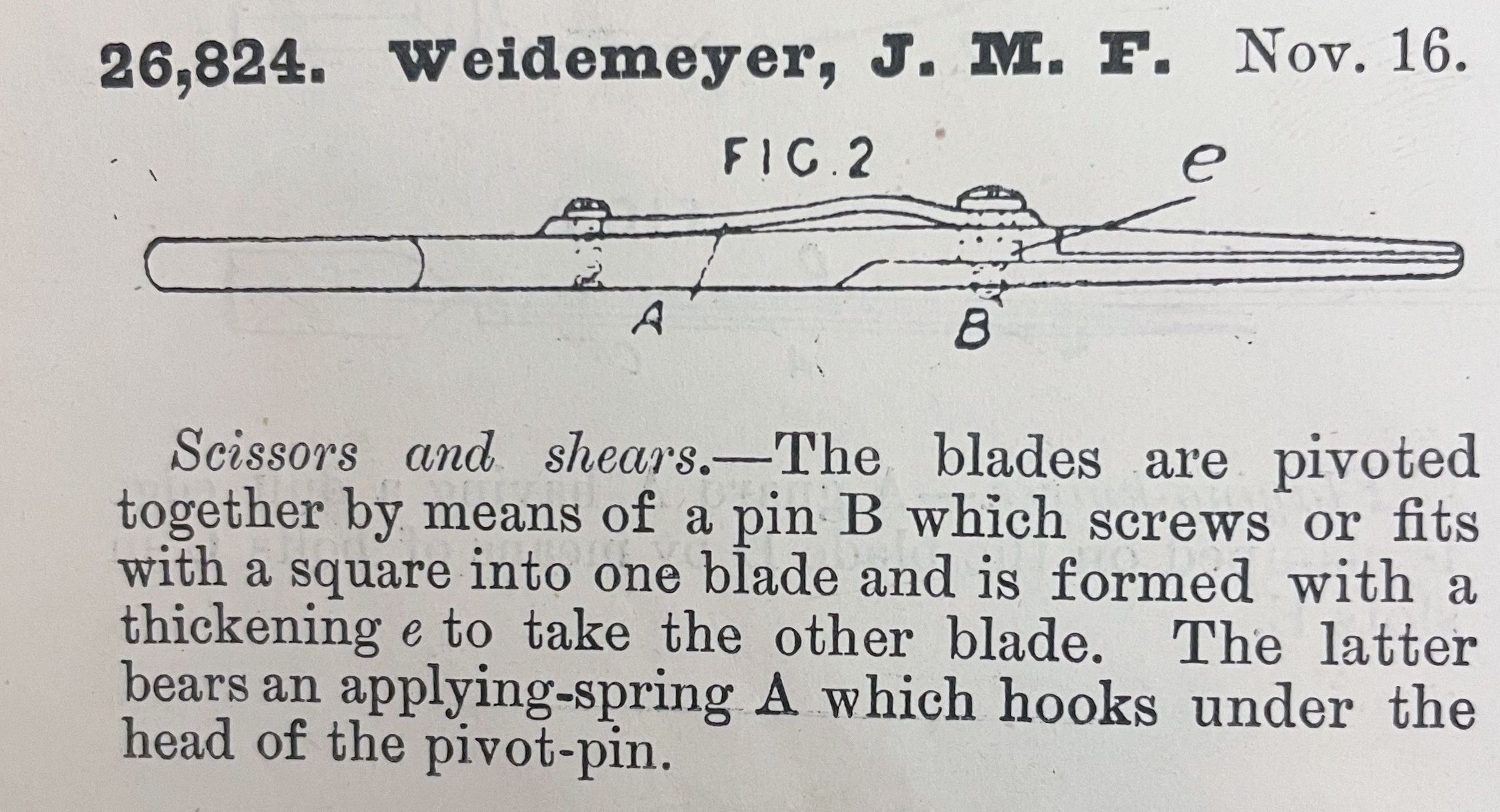 Scissors and shears. -- The blades are pivoted together by means of a pin B which screws or fits with a square into one blade and is formed with a thickening e to take the other blade. The latter bears an applying-spring A which hooks under the head of the pivot-pin.Cataloged By